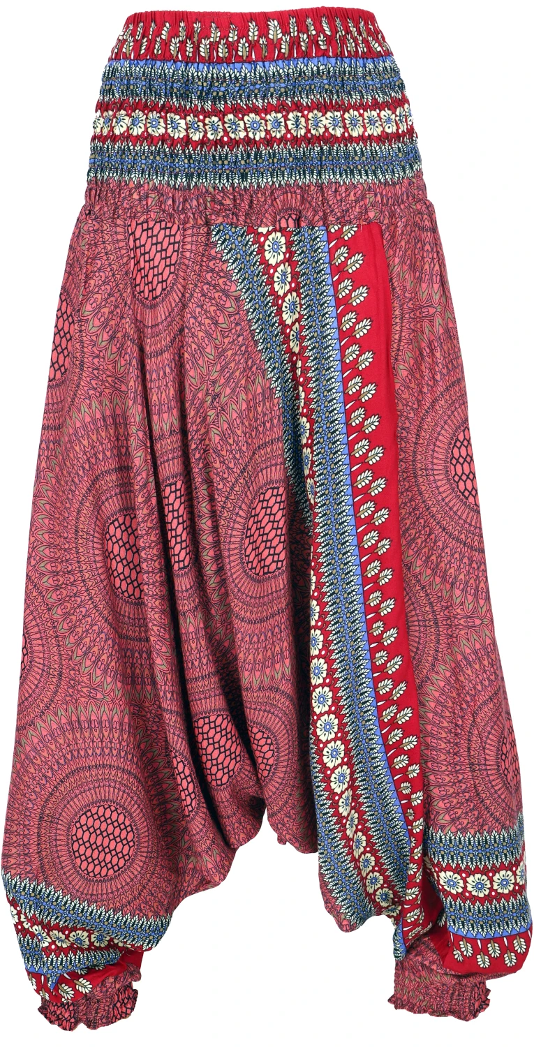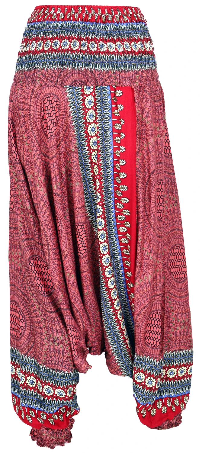 Extraweite Pluderhose mit tief sitzendem Schritt. Der breite, gesmokte Bund wird zum figurbetontem Top und die Hose zum chicen Overall, wenn man sie entsprechend hochzieht.