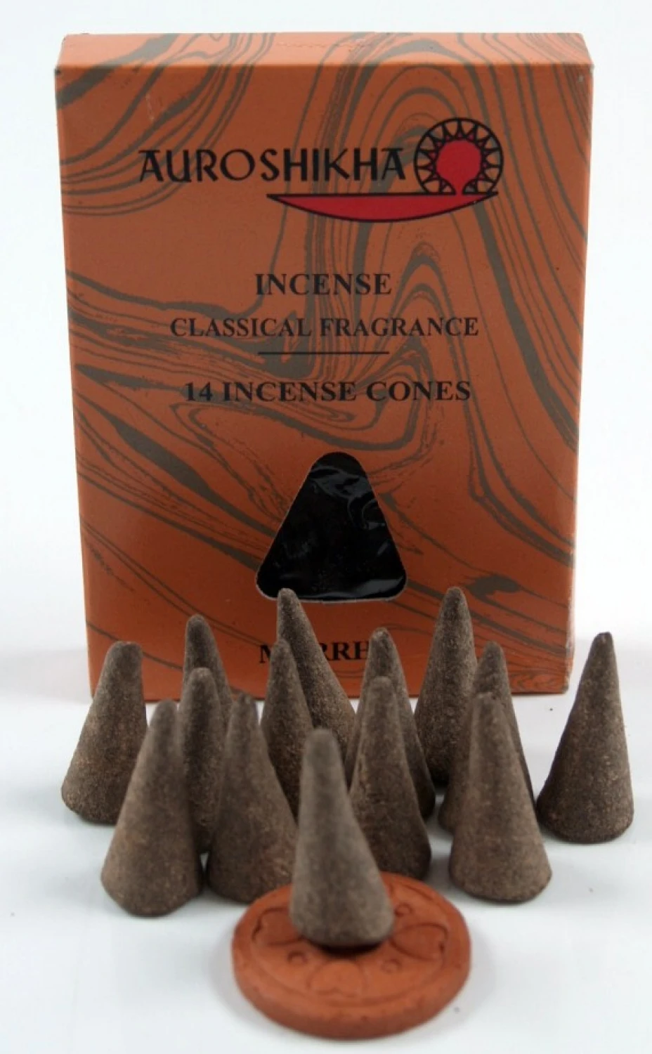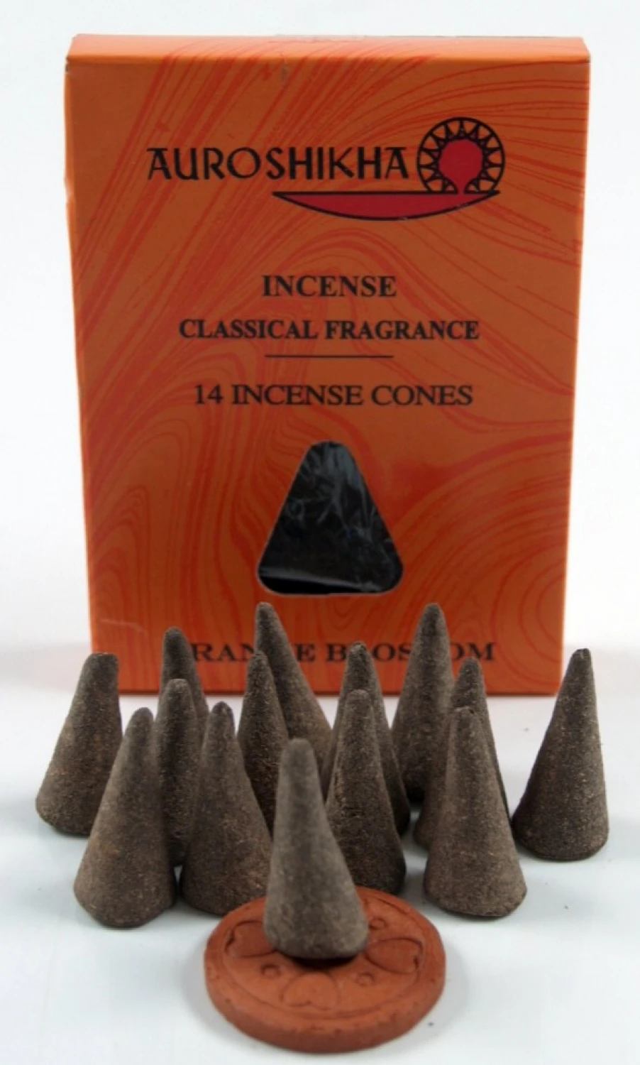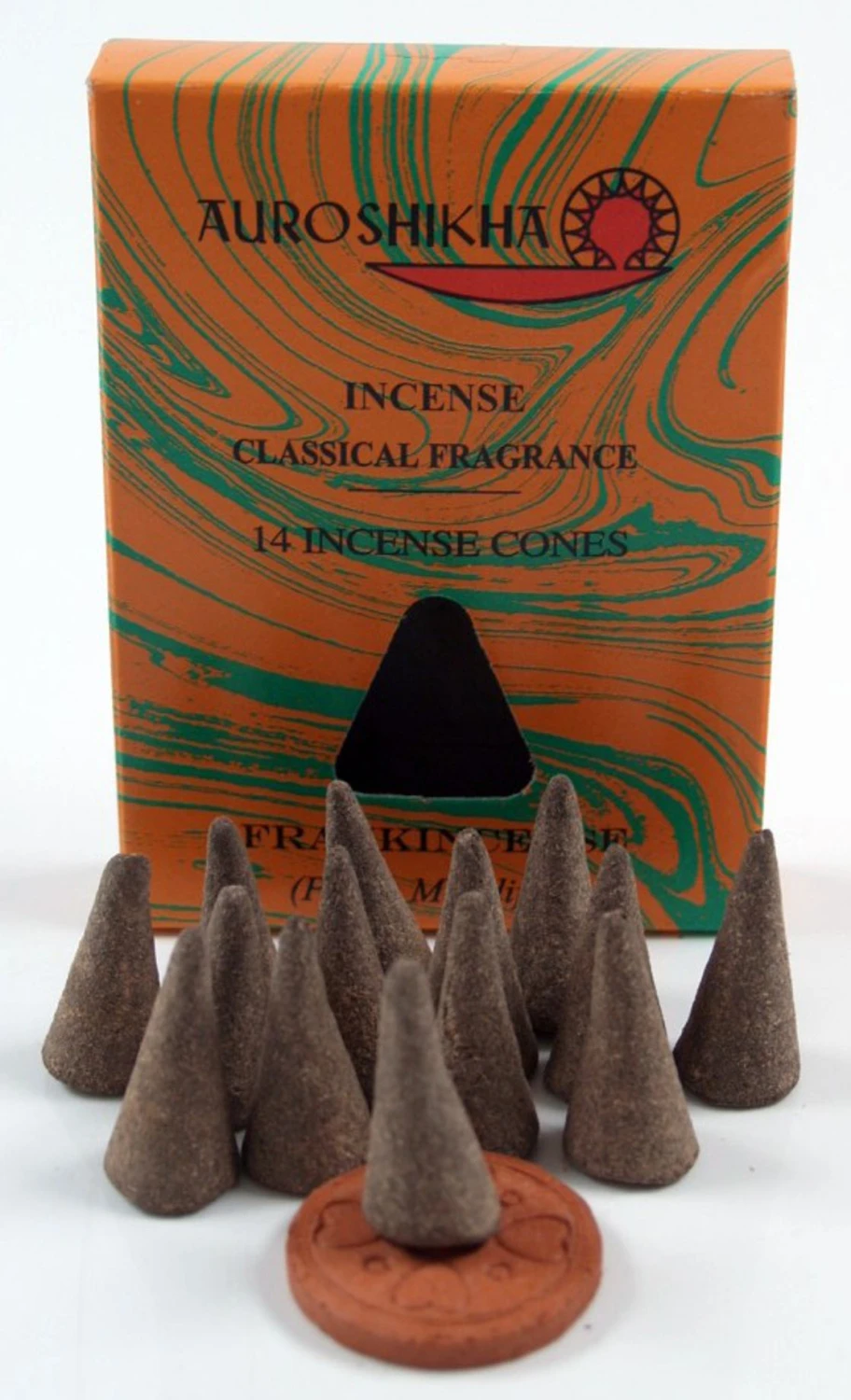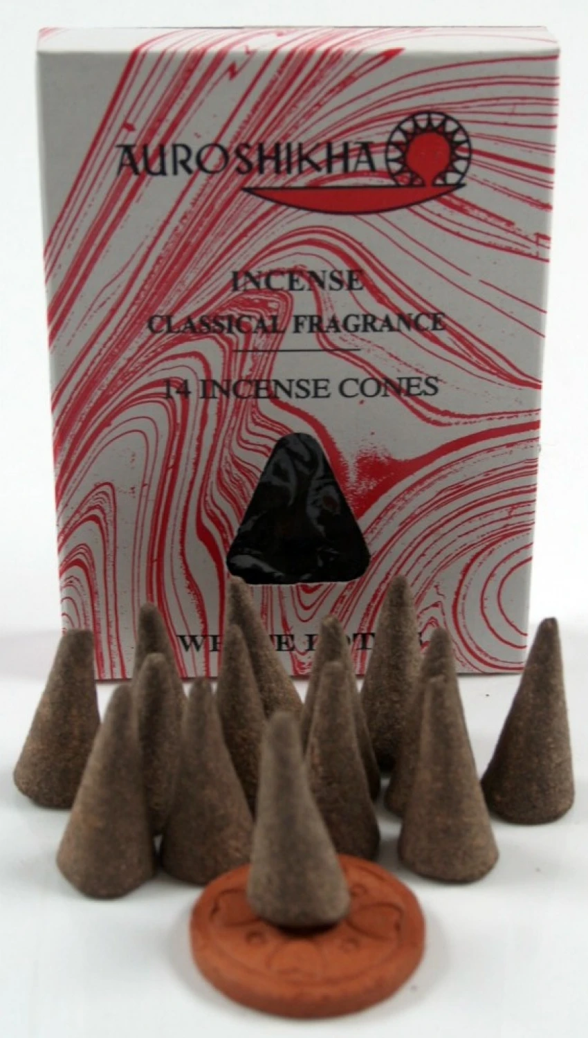Eine sehr bekannte Räucherstäbchenmarke Auroshikha, die von Hand im Aurobindo Ashram (Indien) hergestellt wird. Hier bekommst Du 14 Räucherkegel inklusive kleinem Keramikständer.