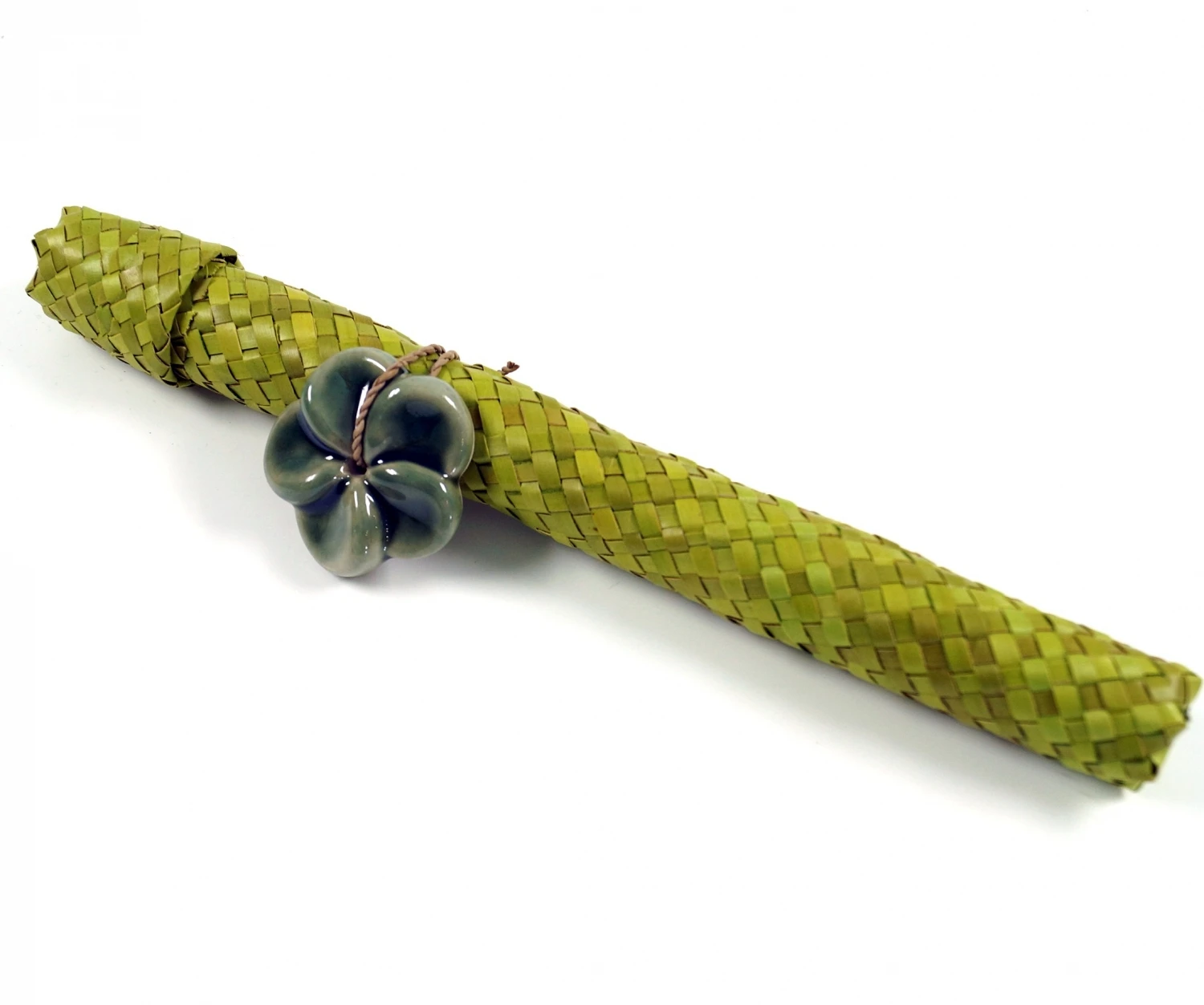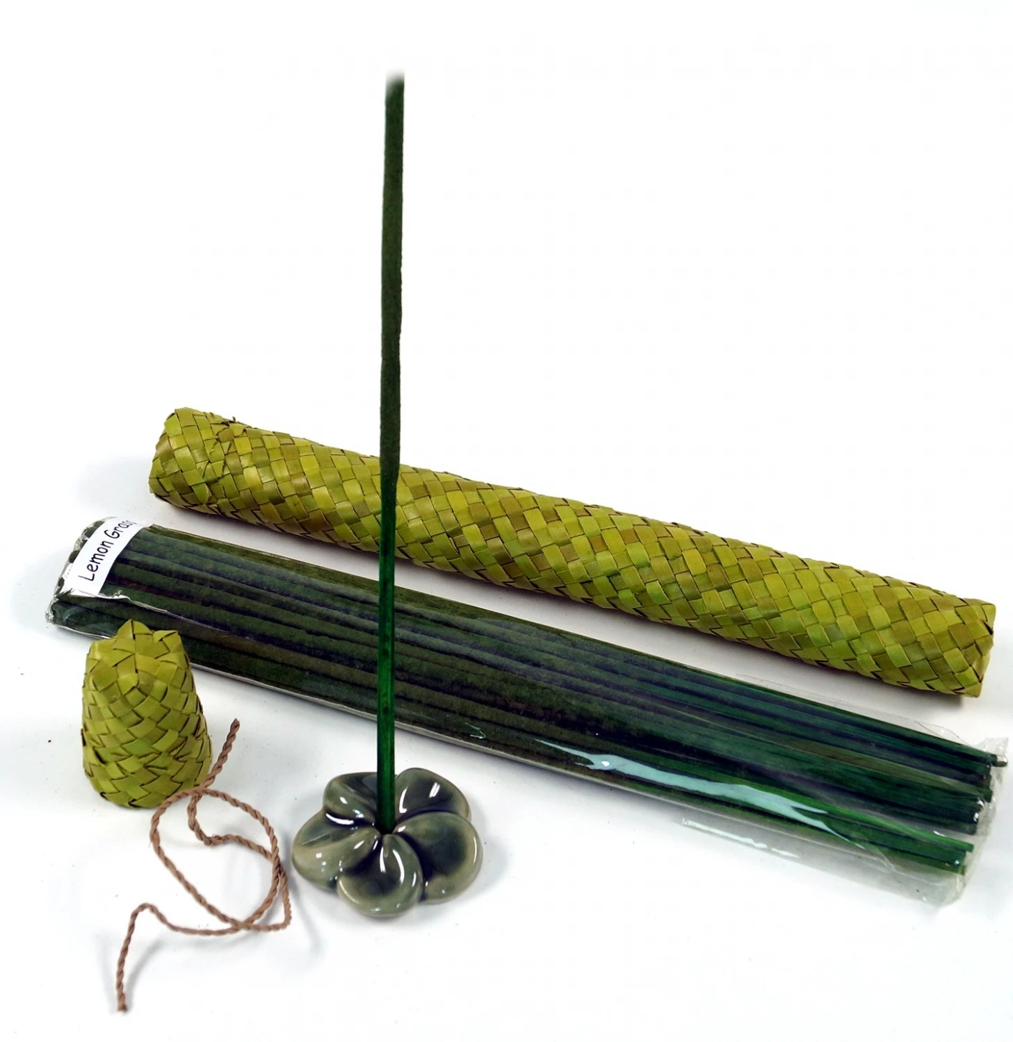 Das Set beinhaltet einen kleinen Keramikhalter und ca. 15 Räucherstäbchen in einer handgeflochtenen Hülle.