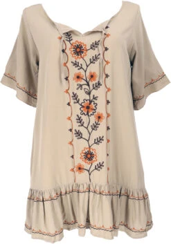 Leichte Tunika mit aufwendiger Stickerei, perfekt für den Strand und den Urlaub. Das kurze Kleid ist auch gut zu kombinieren und eine perfekte Basis für ein stylisches Boho-Outfit. Die Stickerei ist individuell gefertigt und kann in der Anordnung der Farben leicht von der Abbildung abweichen.