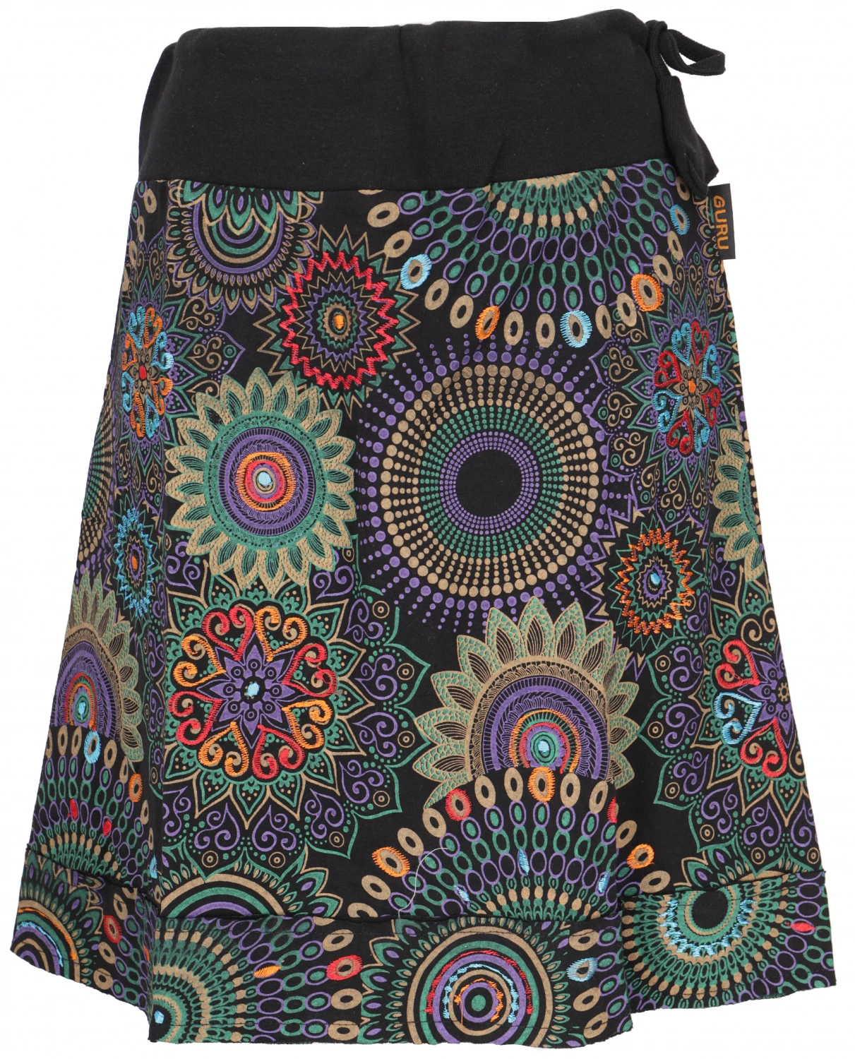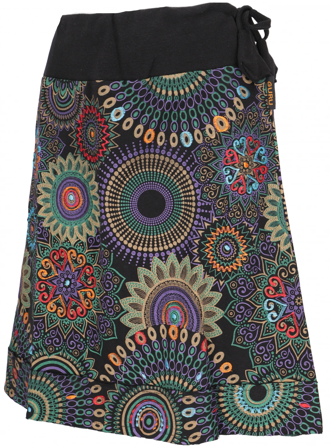 Minirock aus Nepal mit all over Print und Stickerei auf der Vorderseite. Der breite Bund ist elastisch und lässt sich zusätzlich in der Weite mit einem Kordelband regulieren.