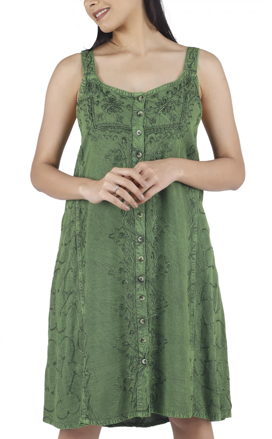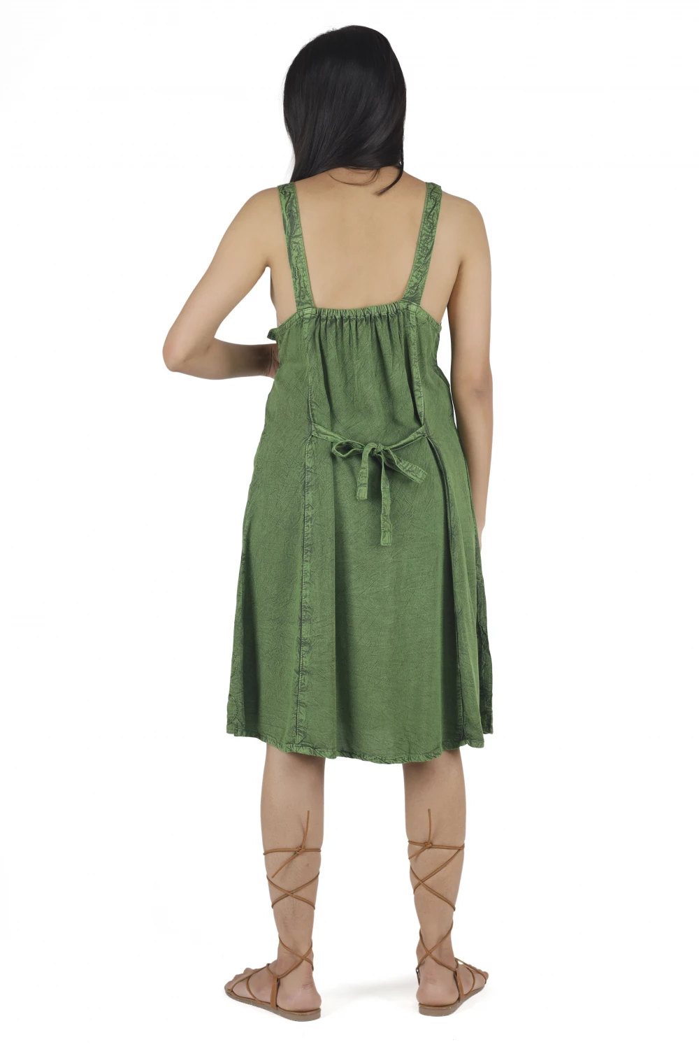 Kurzes Kleid mit dezenten Stickereien. Die Weite der Taille lässt sich durch Bindebänder im Rückenbereich regulieren. Das Kleid hat eine sehr vorteilhafte Länge, bis leicht übers Knie.
