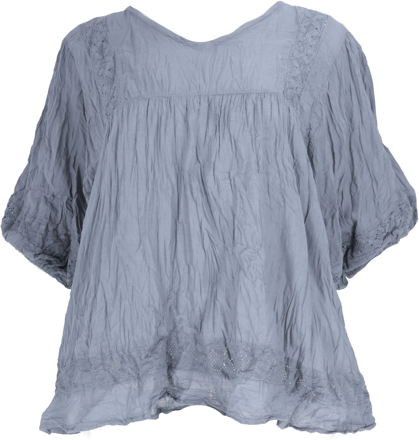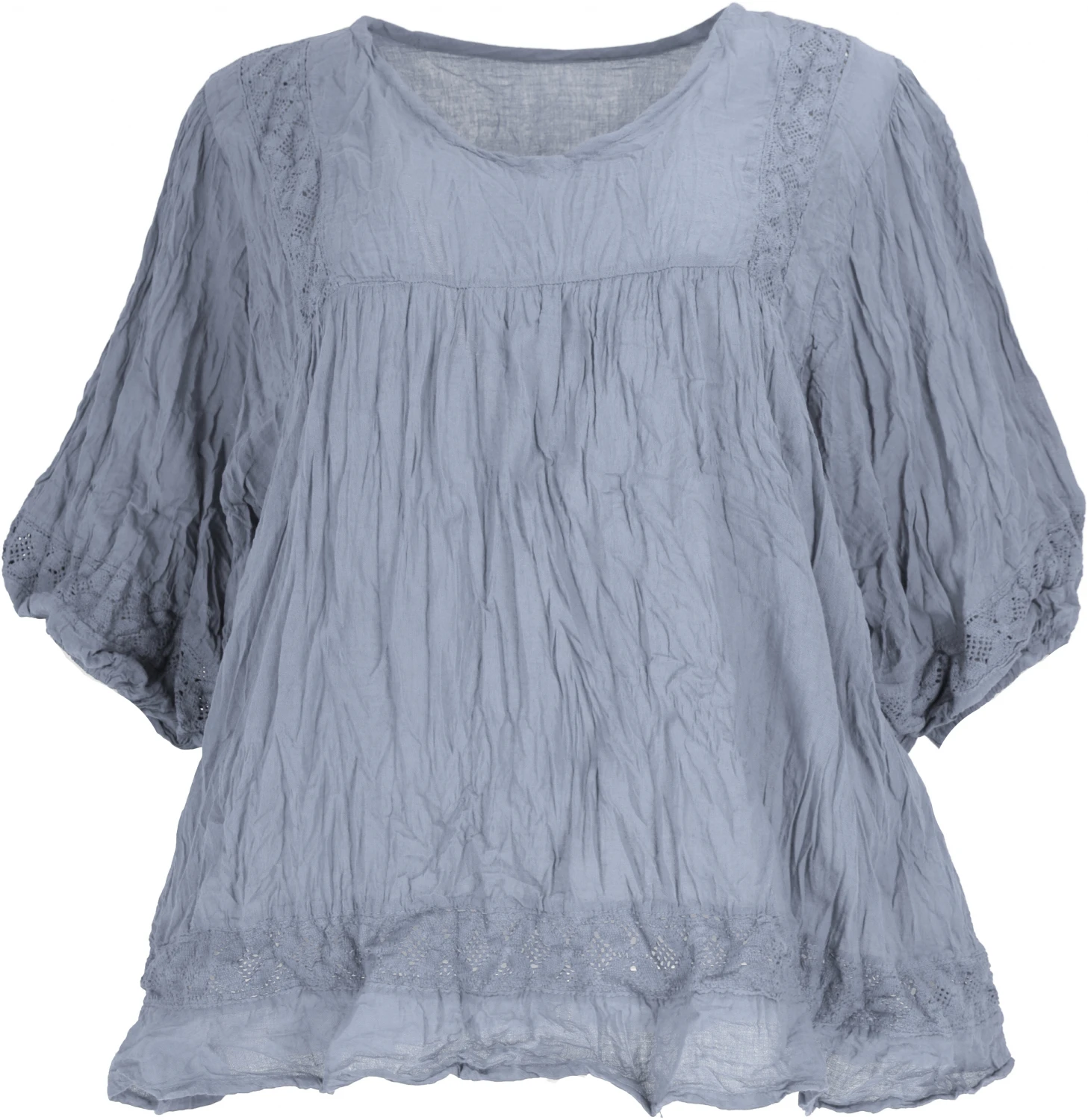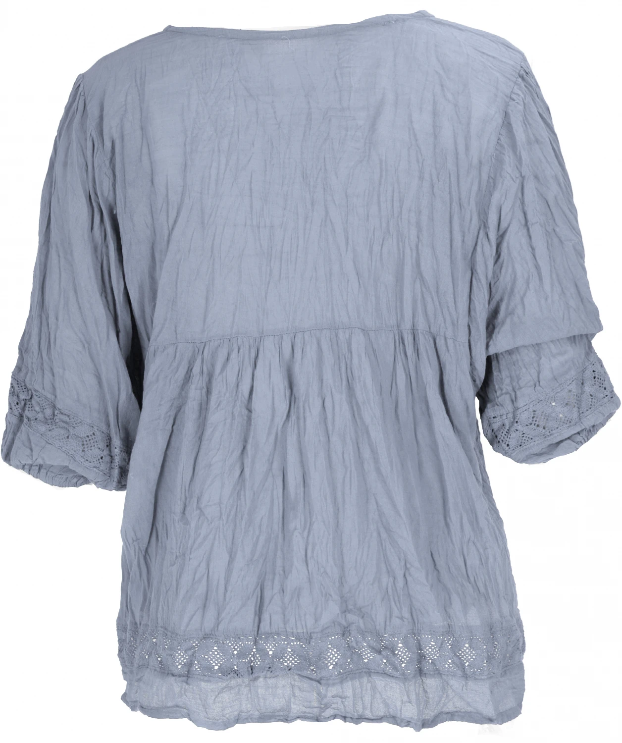 Weite Krinkelbluse mit hübscher Spitzenbordüre. Der leichte Baumwollstoff und der lockere Sitz der Bluse lässt dich beschwingt die Sommerhitze genießen.