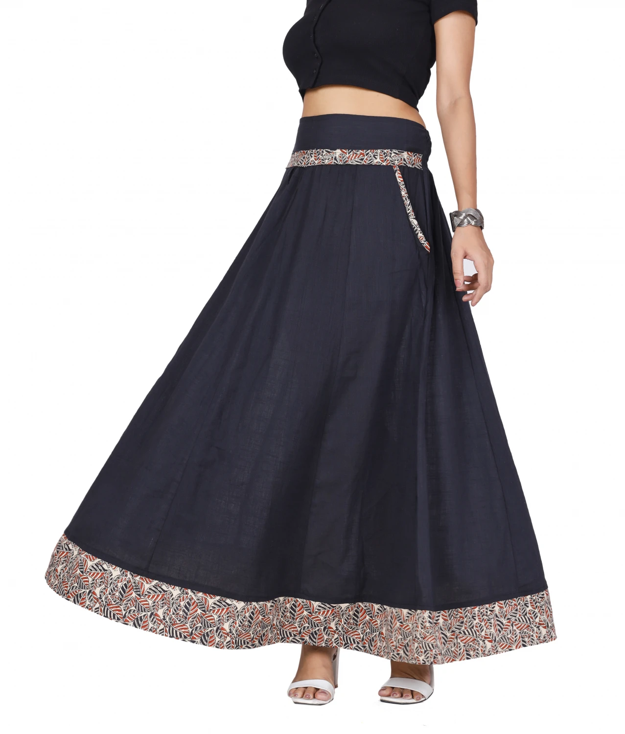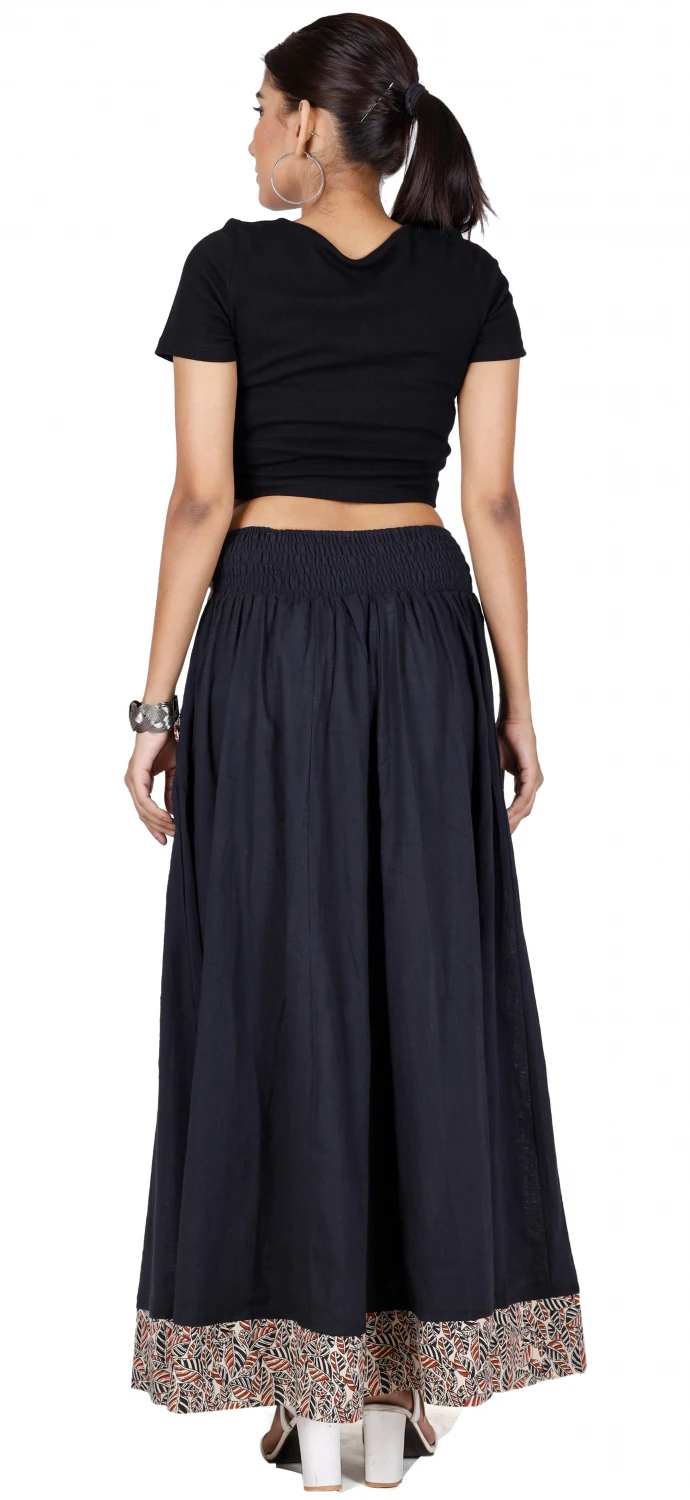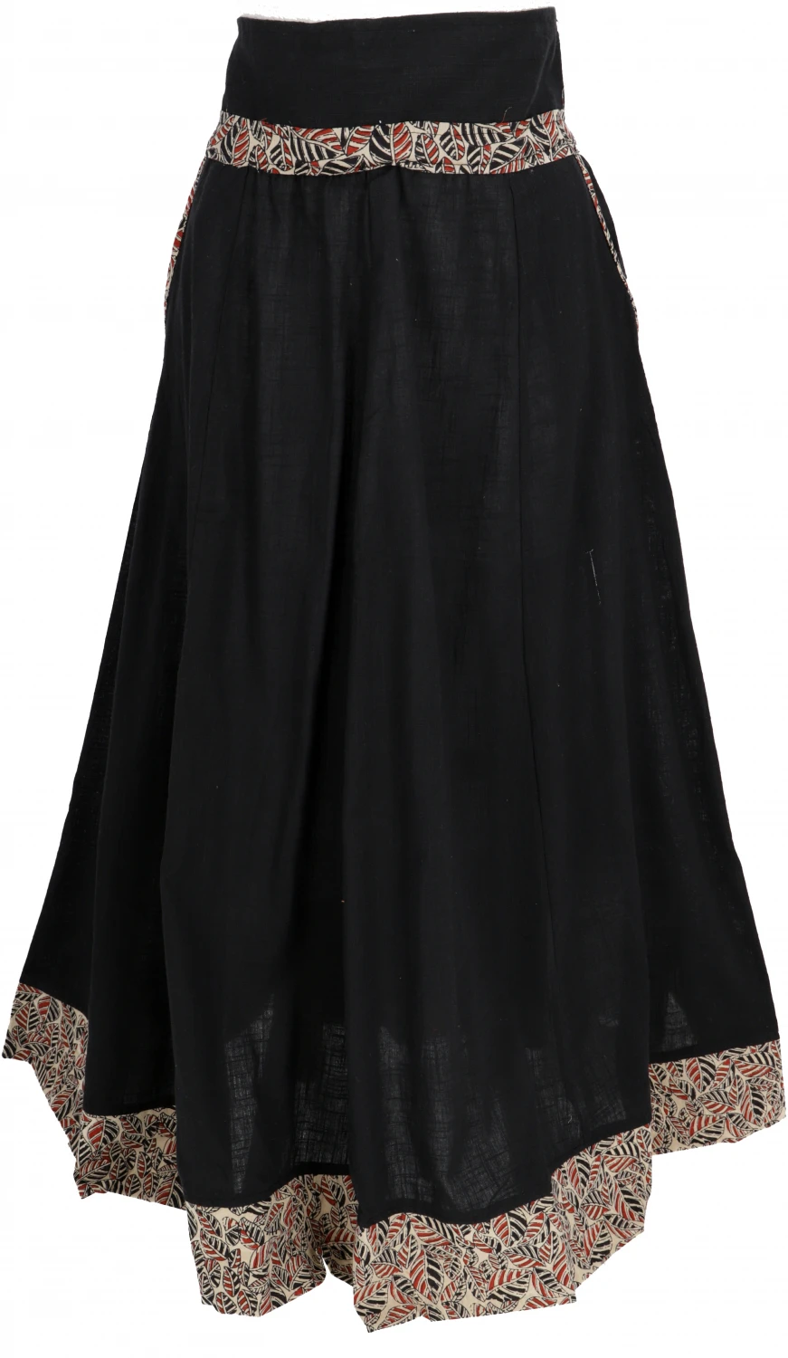 Langer, farblich abgesetzter Maxirock aus luftigem natürlichen Material. Der Stoff der Bordüre ist von Hand bedruckt. Der bequeme Baumwollrock hat einen rückseitigen elastischen Bund und zwei seitliche, farblich abgesetzte Taschen.
