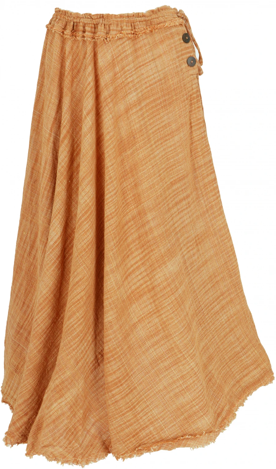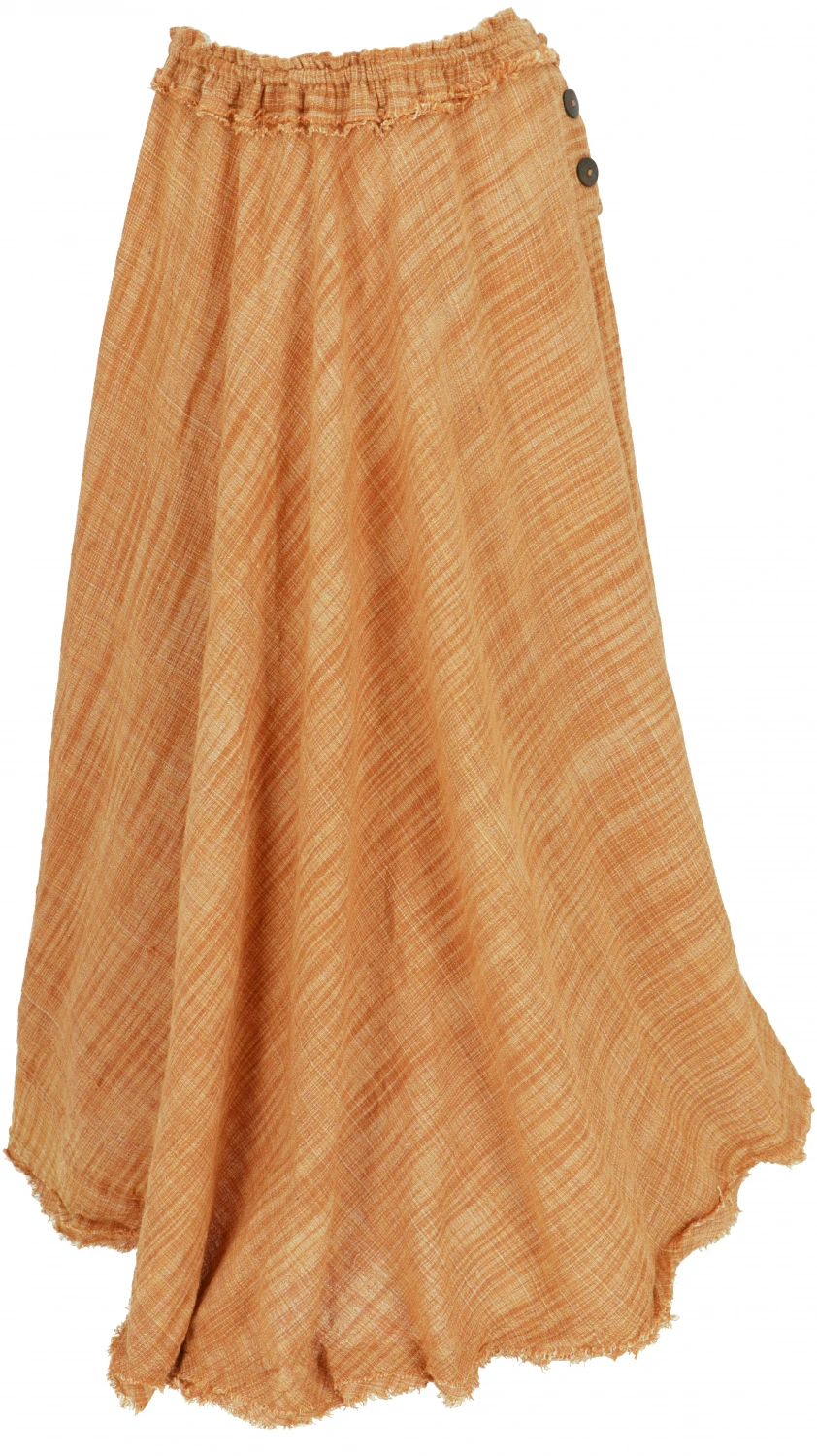 Bequemer, weiter Rock aus traditionell gewebtem indischen Khadi. Der traditionelle Baumwollstoff ist natürlich strukturiert. Seitlich mit Kokosknöpfen versehen, kann die Weite durch einen Tunnelzug reguliert werden. Am Bund und Saum hat der Rock eine natürliche Fransenbordüre.