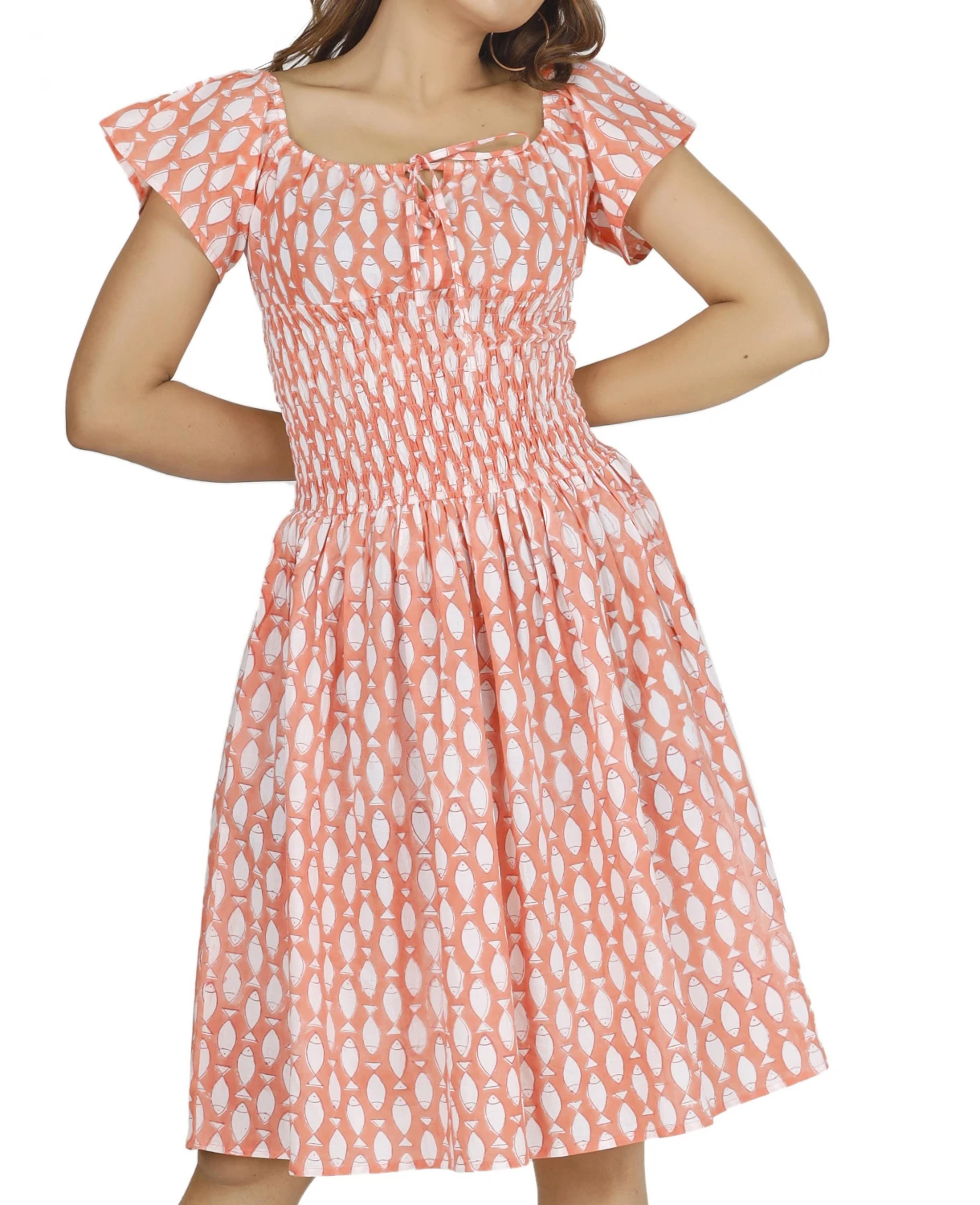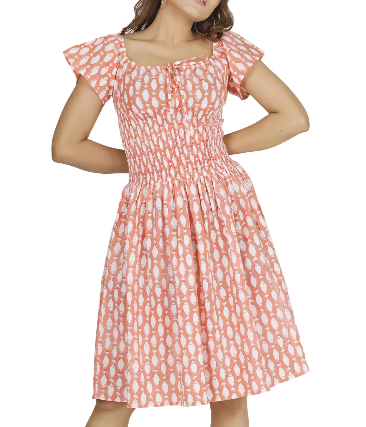 Boho Minikleid, Handbedrucktes Luftiges Sommerkleid, Baumwollkleid – Apricot