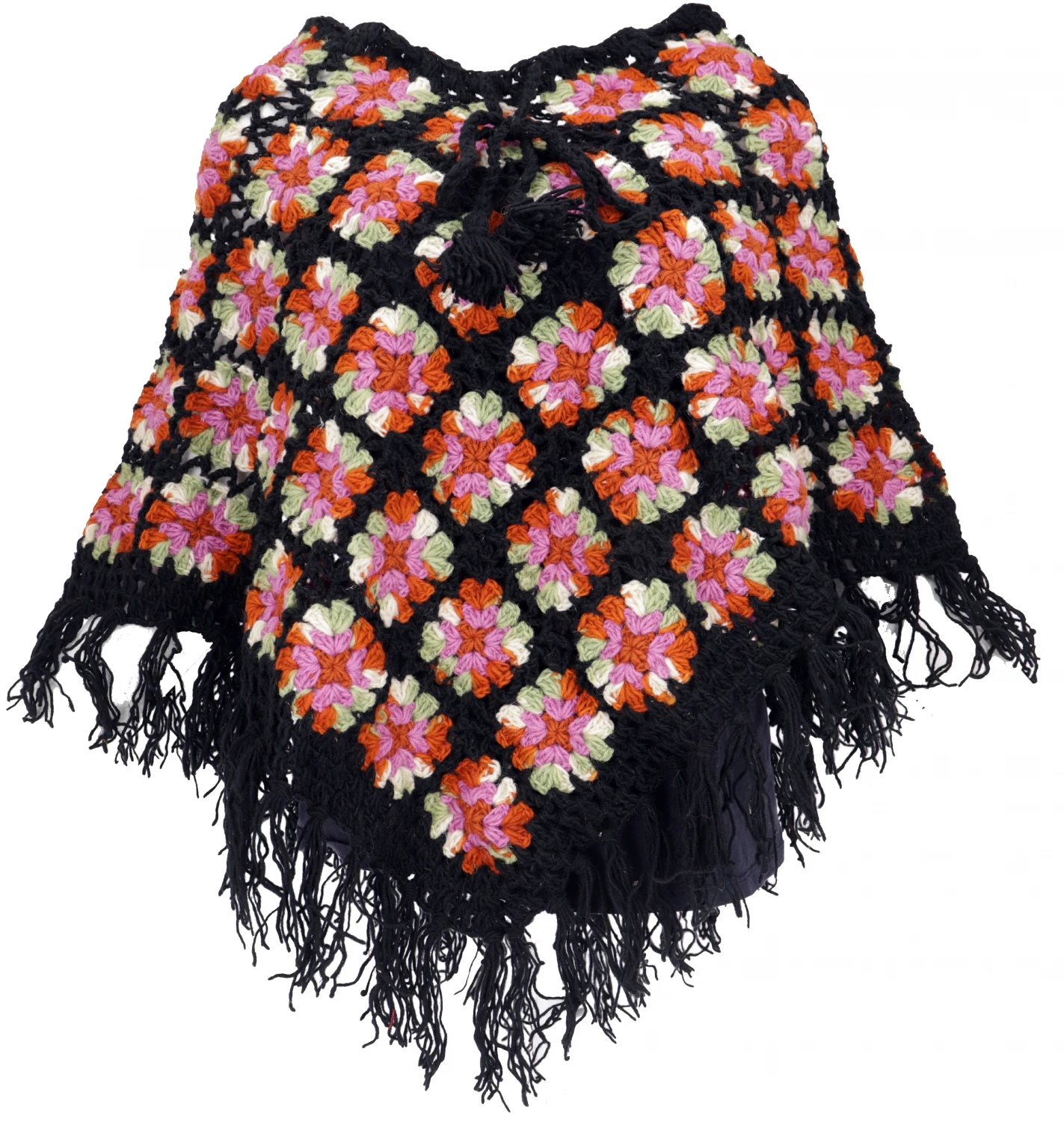 Hippie Goa Poncho aus gehäkeltem granny square aus reiner Schurwolle. Der farbenfrohe Poncho ist ein individuelles, von Hand gefertigtes Unikat und kann deshalb leicht von der Abbildung abweichen.
