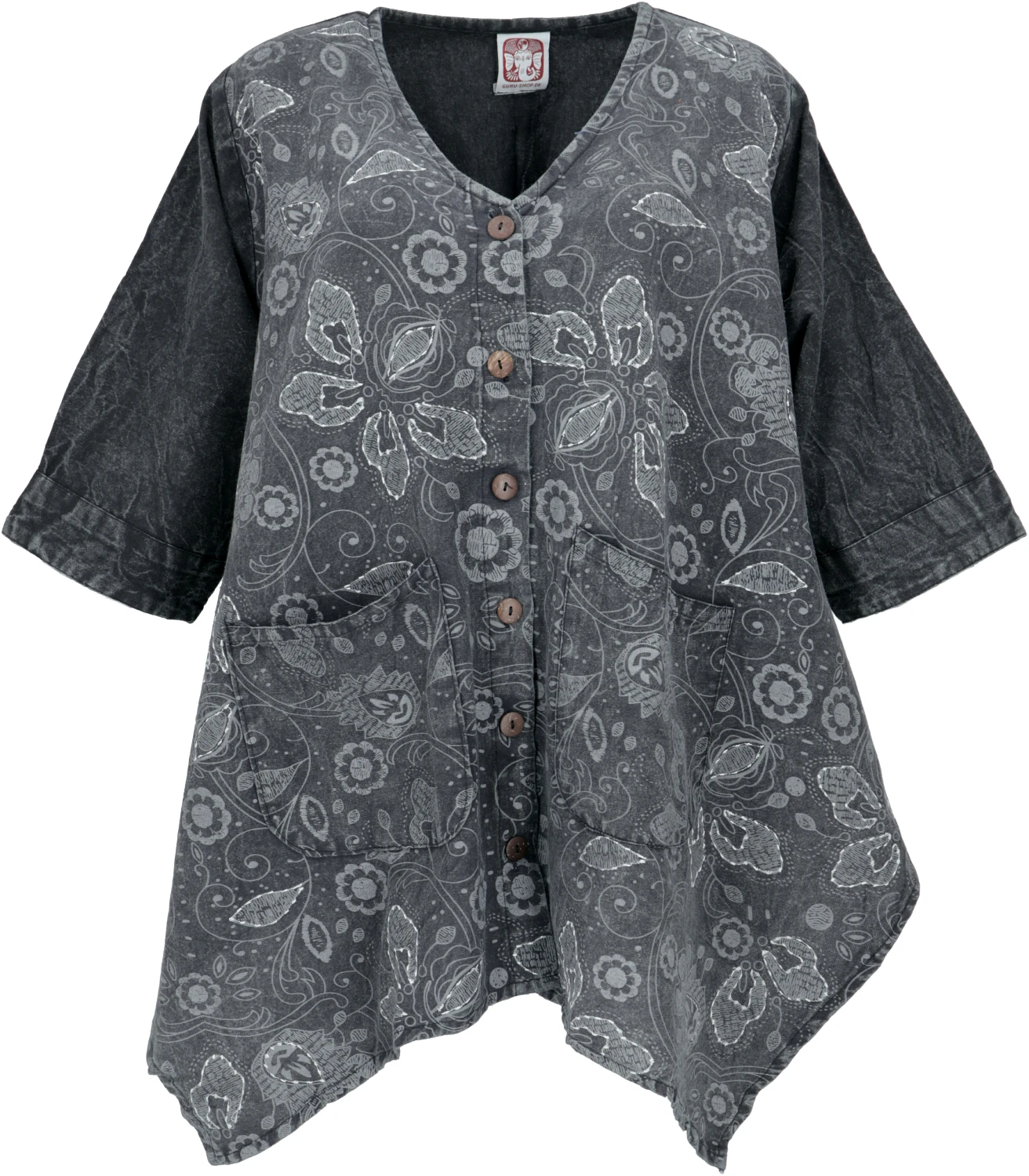 Boho-Tunika aus Nepal mit dezentem Druck und farblich abgestimmter Stickerei. Die locker fallende Bluse hat einen sehr vorteilhaften Schnitt und ist sehr bequem. Der A-Linien-Schnitt bietet viel Raum und schmeichelt der Figur