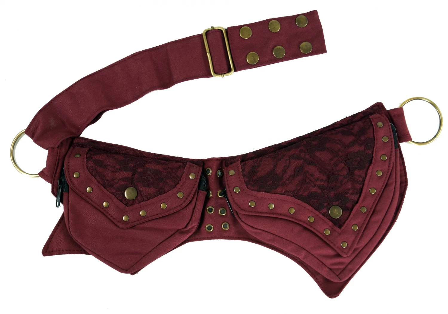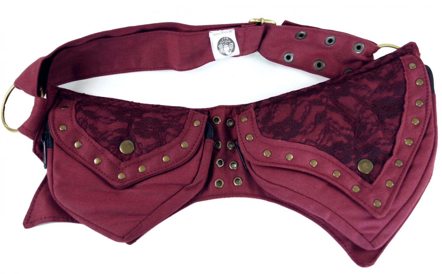 Ausgefallene Gürteltasche aus festem Canvas Baumwollstoff mit Nieten und Spitze. Die separaten Taschen bieten viel Stauraum. Auf der Innenseite des Gürtels befinden zwei Sicherheitsfächer mit Reißverschluss.