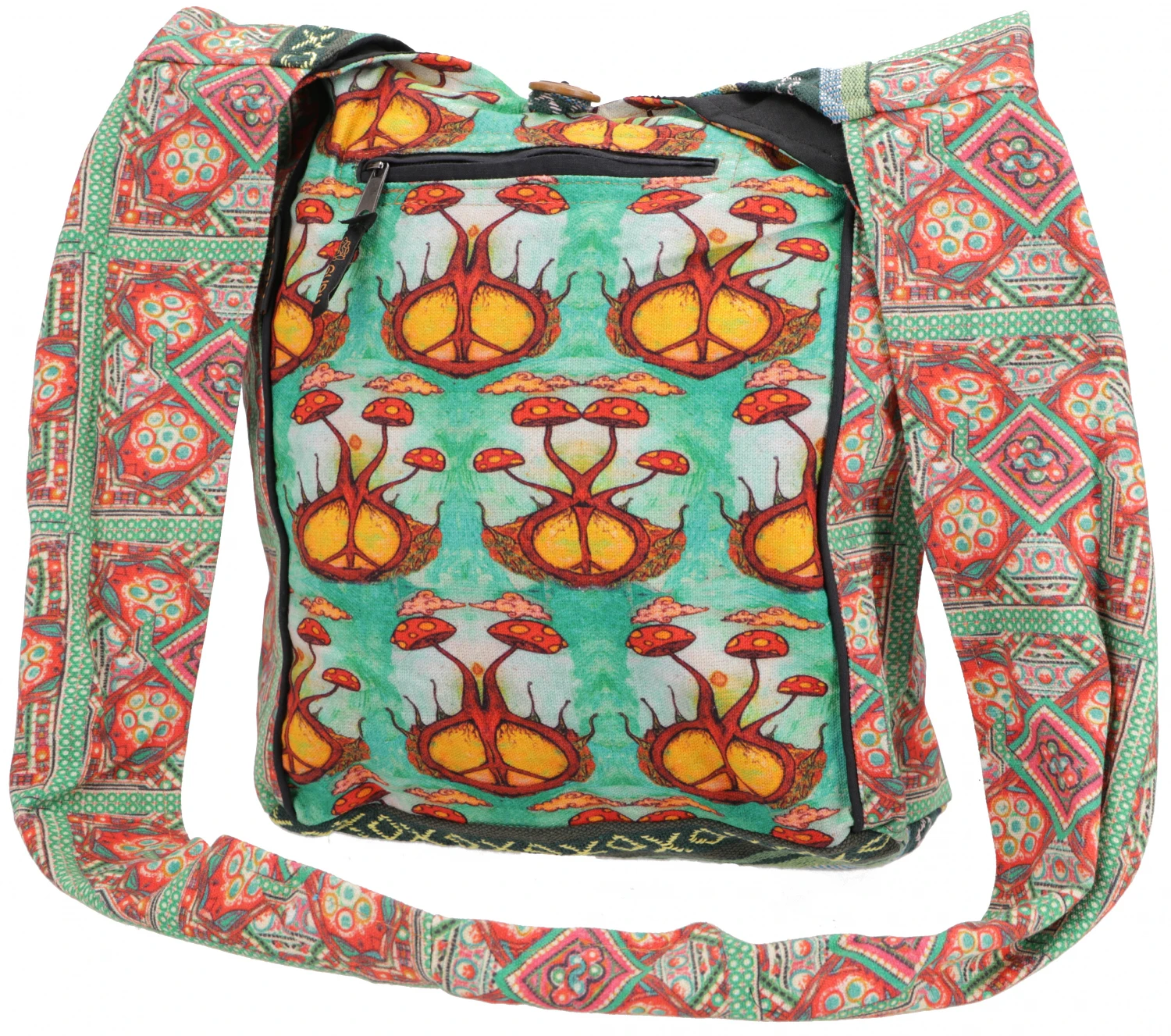 Diese Schultertasche ist ein echtes Platzwunder. Das große Hauptfach mit Zusatzfach für Geldbeutel und das kleine Fach auf der Vorderseite bieten viel Platz und gleichzeitig kann man Ordnung halten. Der farbenfrohe Druck in Kombination mit traditionellem nepalesischen Webstoff sind eine tolle Kombination. Der Gurt ist breit genug um ihn bequem über die Schulter zu legen.