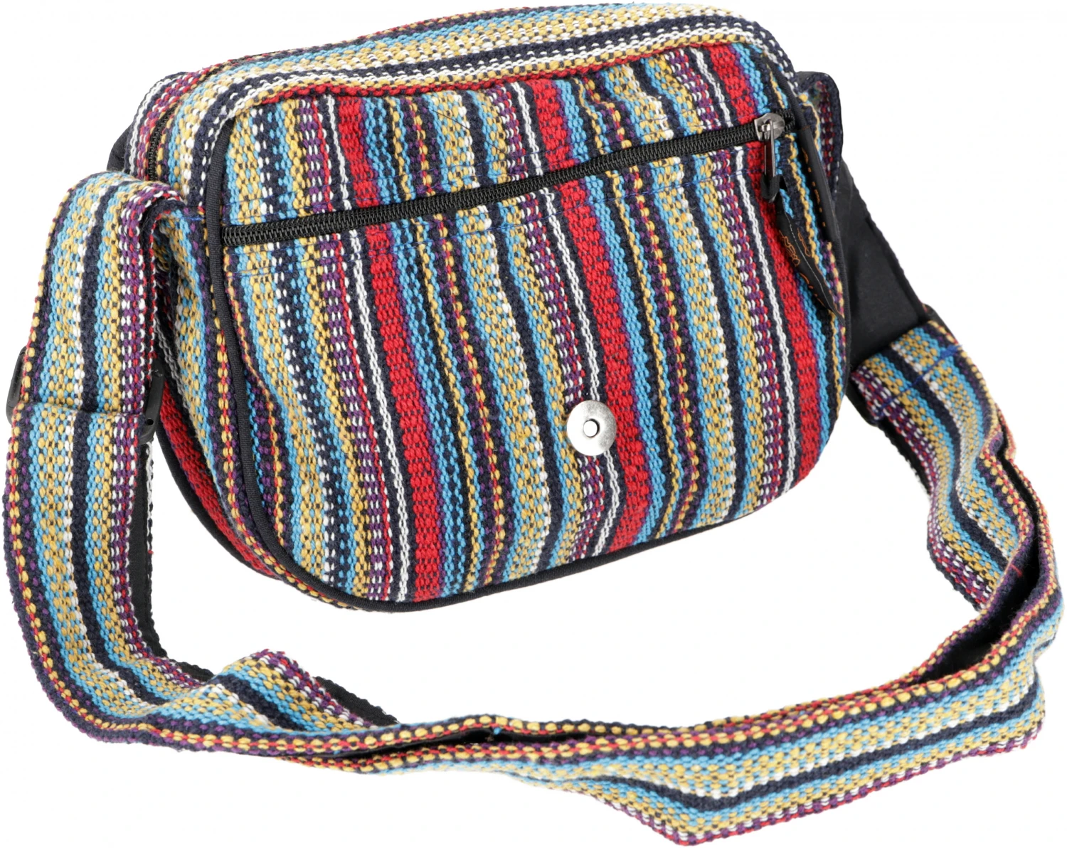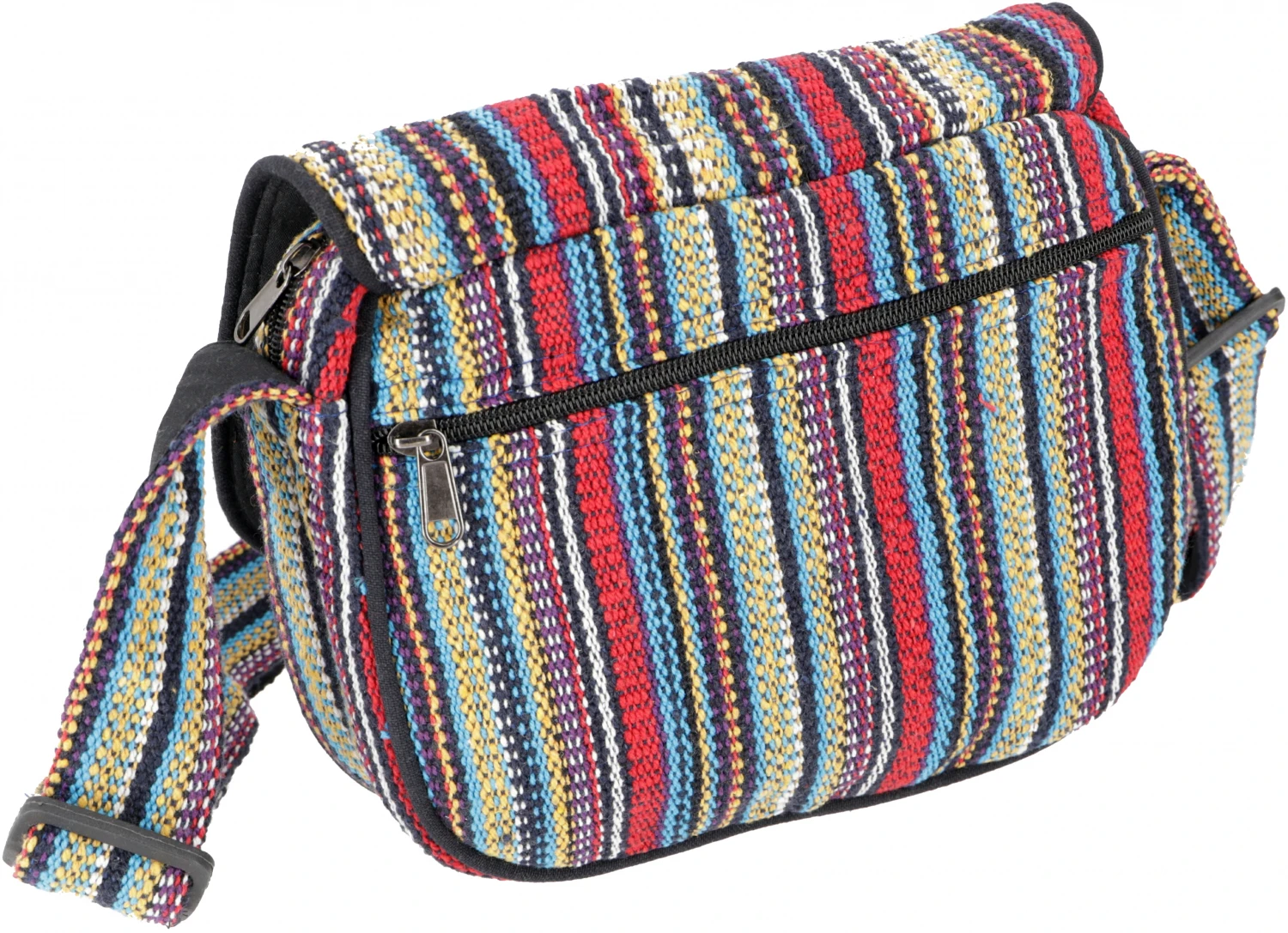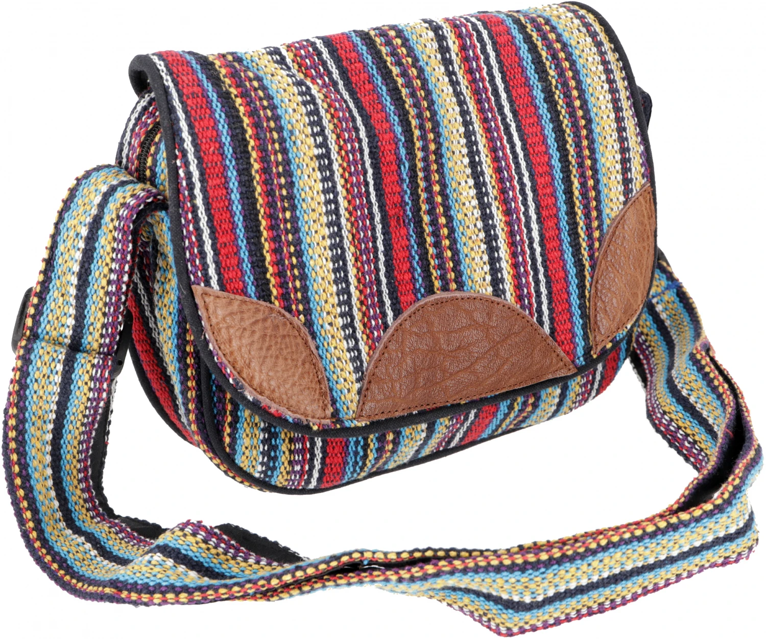 Schöne Schultertasche aus traditionellem nepalesischem Webstoff mit Lederapplikation. Ein großes Hauptfach bietet viel Stauraum. Eine kleine Innentasche, ein Fach direkt unter dem Klappdeckel und eins auf der Rückseite ermöglichen es, Kleinkram gut zu sortieren und schnell zur Hand zu haben. Alle Fächer sind mit einem Reißverschluss versehen. Der Schultergurt ist in der Länge verstellbar.