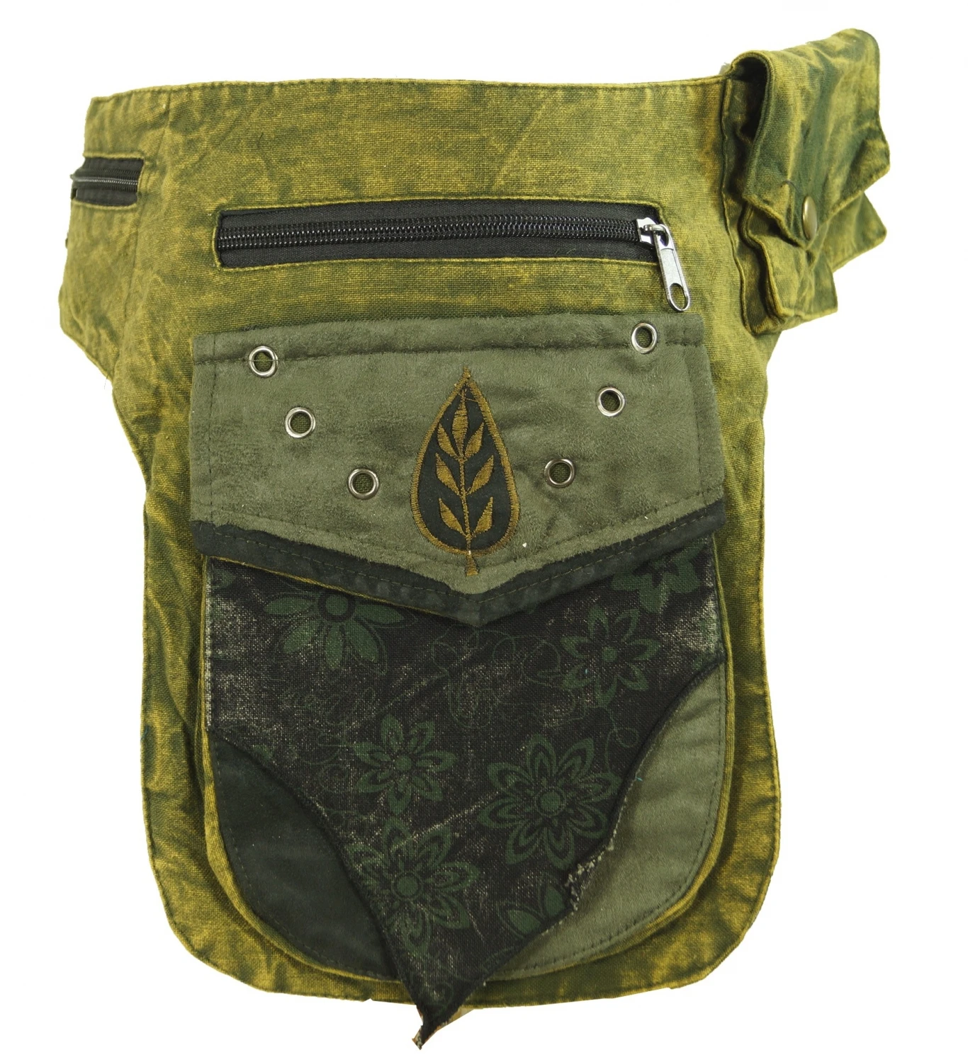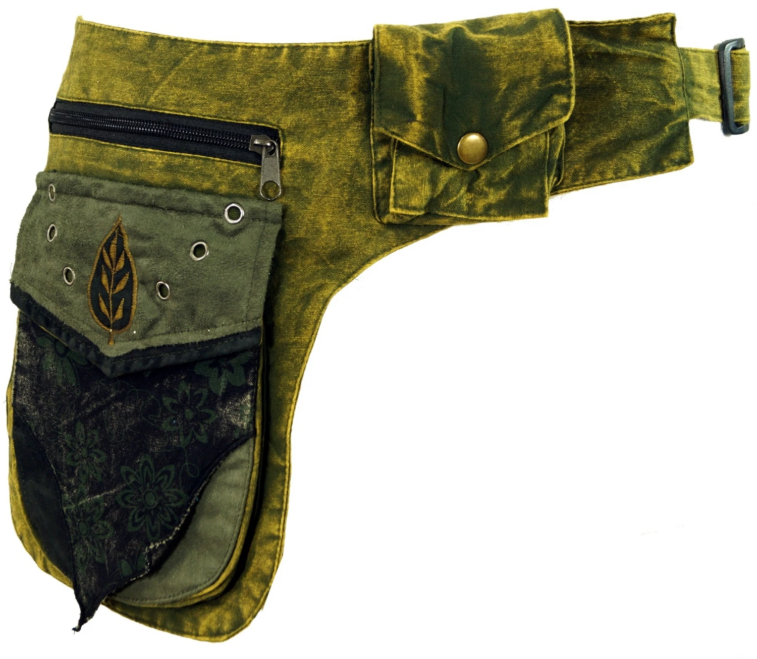 Praktische Gürteltasche aus Stoff mit zwei Reißverschlusstaschen, einer Druckknopftasche und einem großen Hauptfach mit Klettverschluss. Ein weiteres Reißverschlussfach befindet sich auf der Rückseite des Hauptfaches. Die farblich abgestimmten Stoffteile und die Schmuckelemente geben dieser Tasche ihren ganz individuellen Touch.