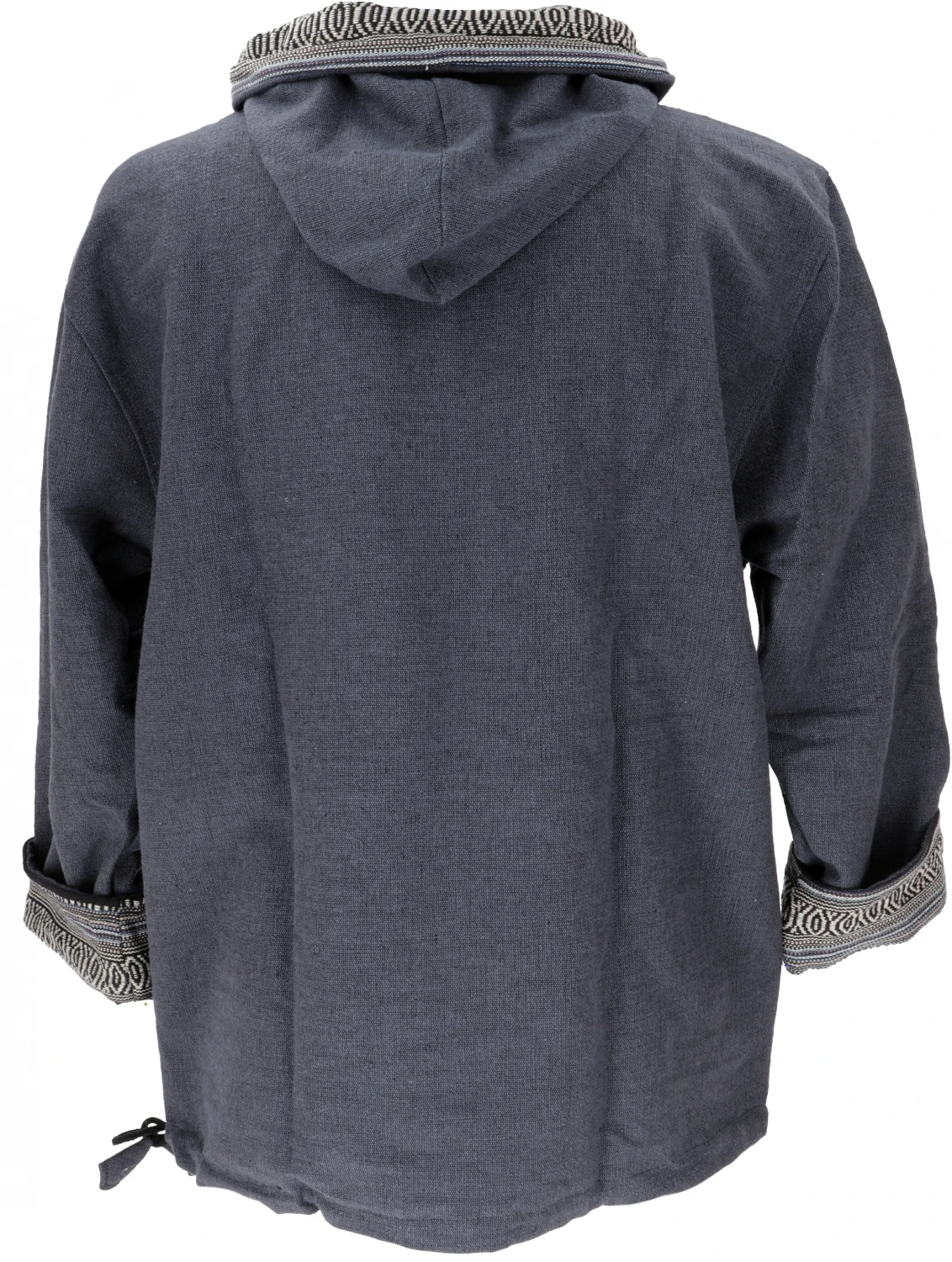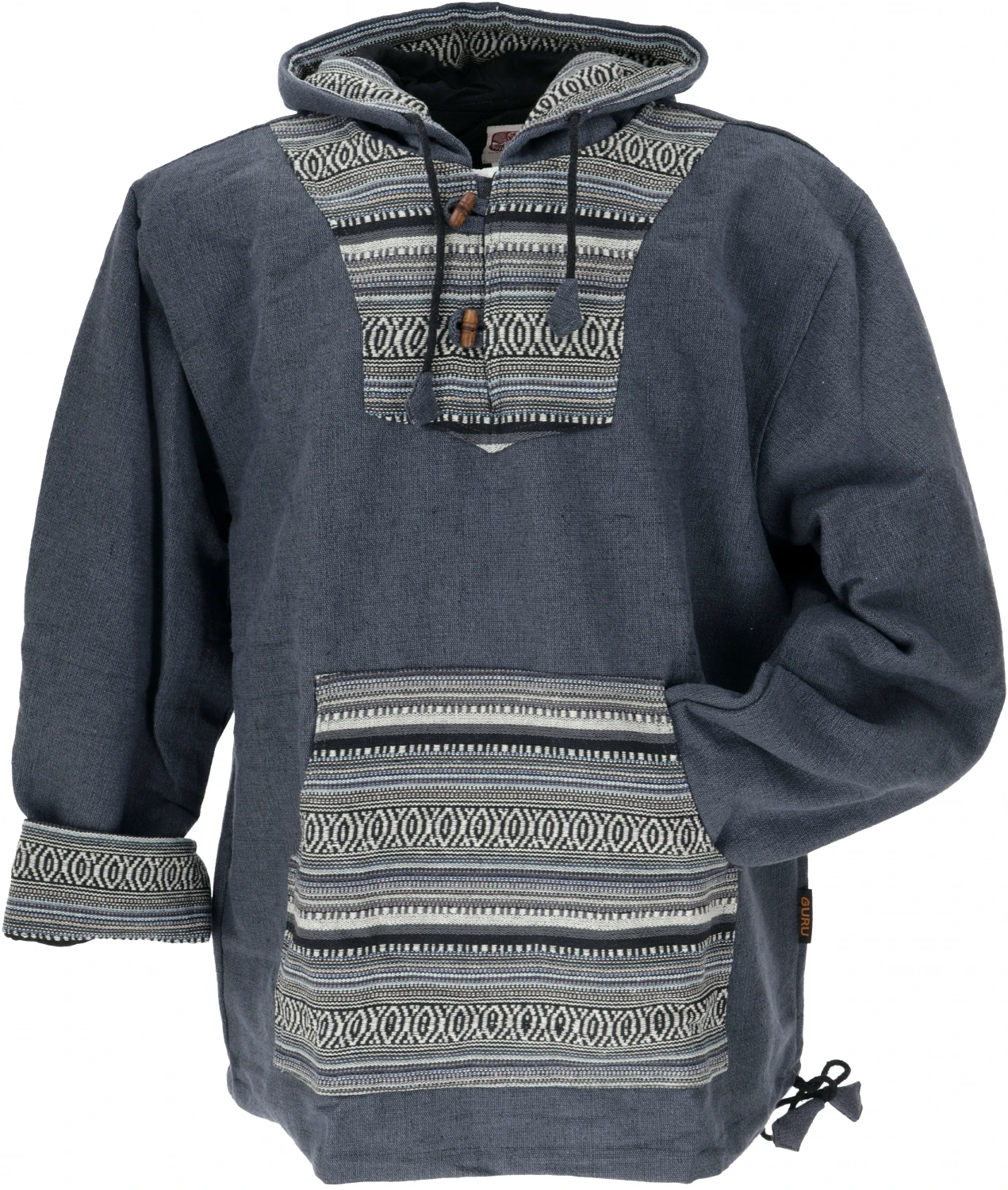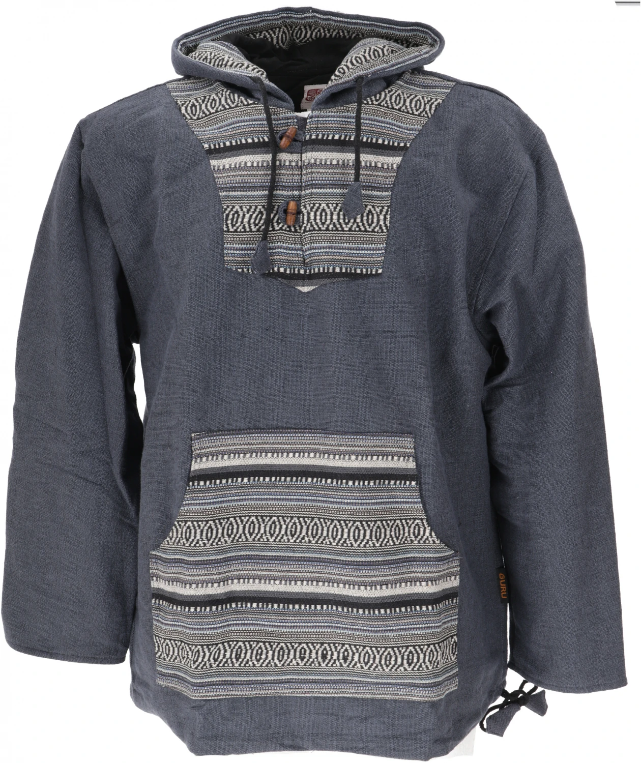 Cooler Kapuzenpulli aus festem Baumwoll-Webstoff im Ethnolook mit natürlichen Holzknöpfen und spitzer Kapuze. Das feste Material wird traditionell in Nepal gewebt. Tasche, Kapuze und Innenseite der Ärmel sind farblich abgesetzt und bilden einen schönen Kontrast. In den großen Kängurutaschen kann man sich die Hände aufwärmen. Das Innenfutter aus natürlicher Baumwolle macht diesen Hoody zu einem kuschelig warmen Lieblingsteil. Die Ärmel sind im unteren Teil mit dem Webstoff gefüttert, so dass man sie auch gut krempeln kann.