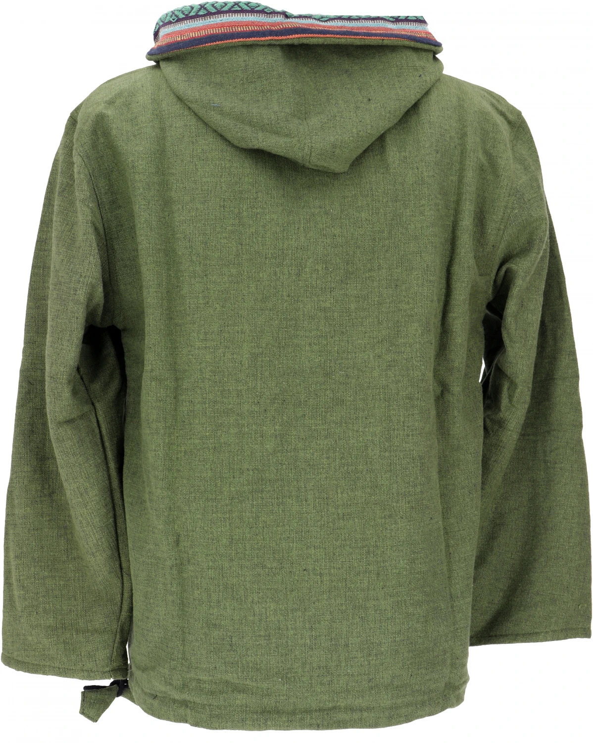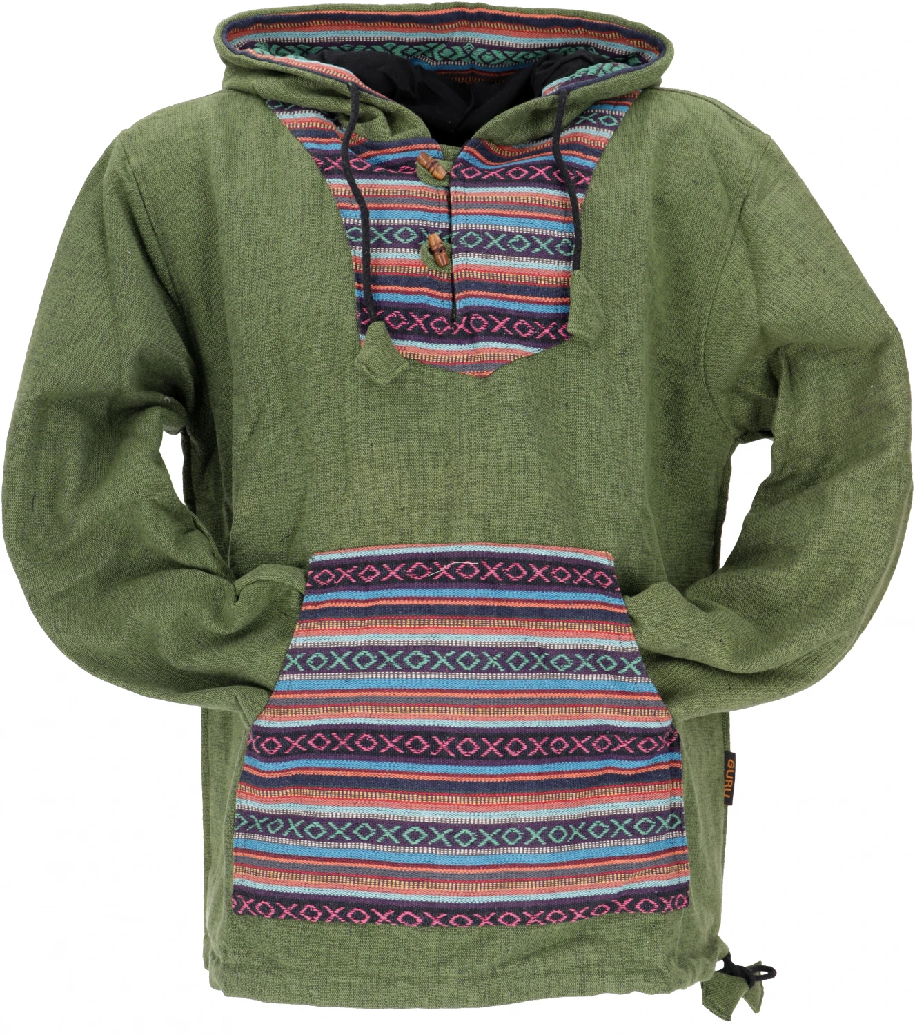 Cooler Kapuzenpulli aus festem Baumwoll-Webstoff im Ethnolook mit natürlichen Holzknöpfen und spitzer Kapuze. Das feste Material wird traditionell in Nepal gewebt. Tasche, Kapuze und Innenseite der Ärmel sind farblich abgesetzt und bilden einen schönen Kontrast. In den großen Kängurutaschen kann man sich die Hände aufwärmen. Das Innenfutter aus natürlicher Baumwolle macht diesen Hoody zu einem kuschelig warmen Lieblingsteil. Die Ärmel sind im unteren Teil mit dem Webstoff gefüttert, so dass man sie auch gut krempeln kann.