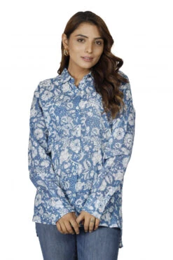 Handbedrucktes Boho Langarmhemd, Luftiges Unisex Hemd – Hellblau