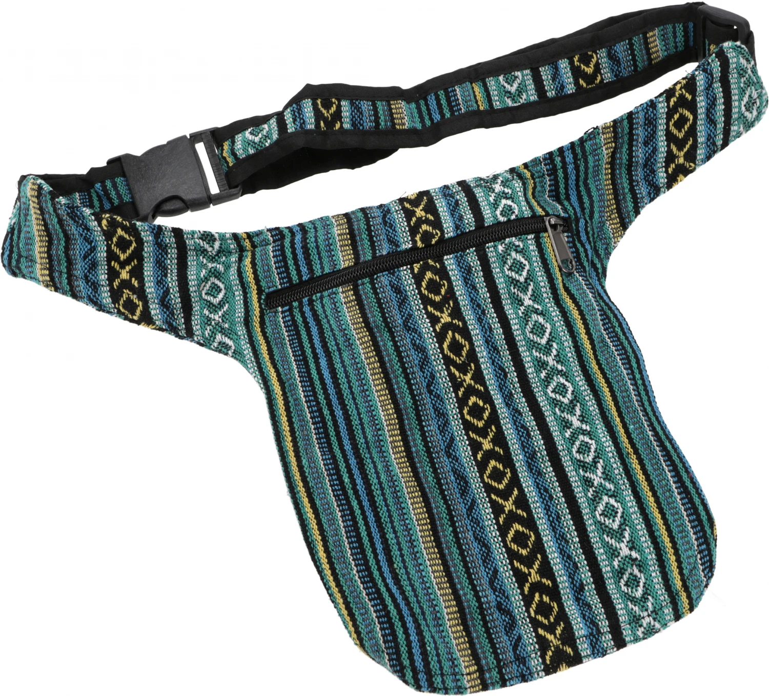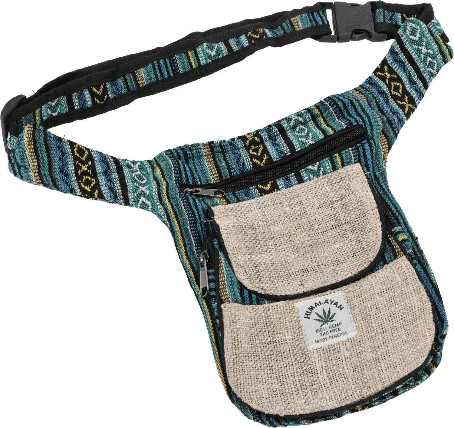 Praktische Gürteltasche aus Hanffaser in Kombination mit traditionellem Webstoff aus Nepal.