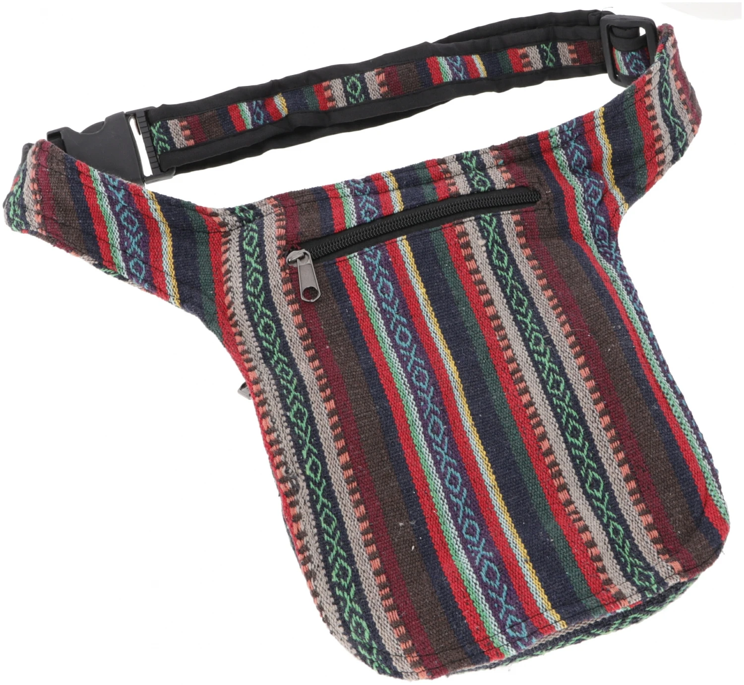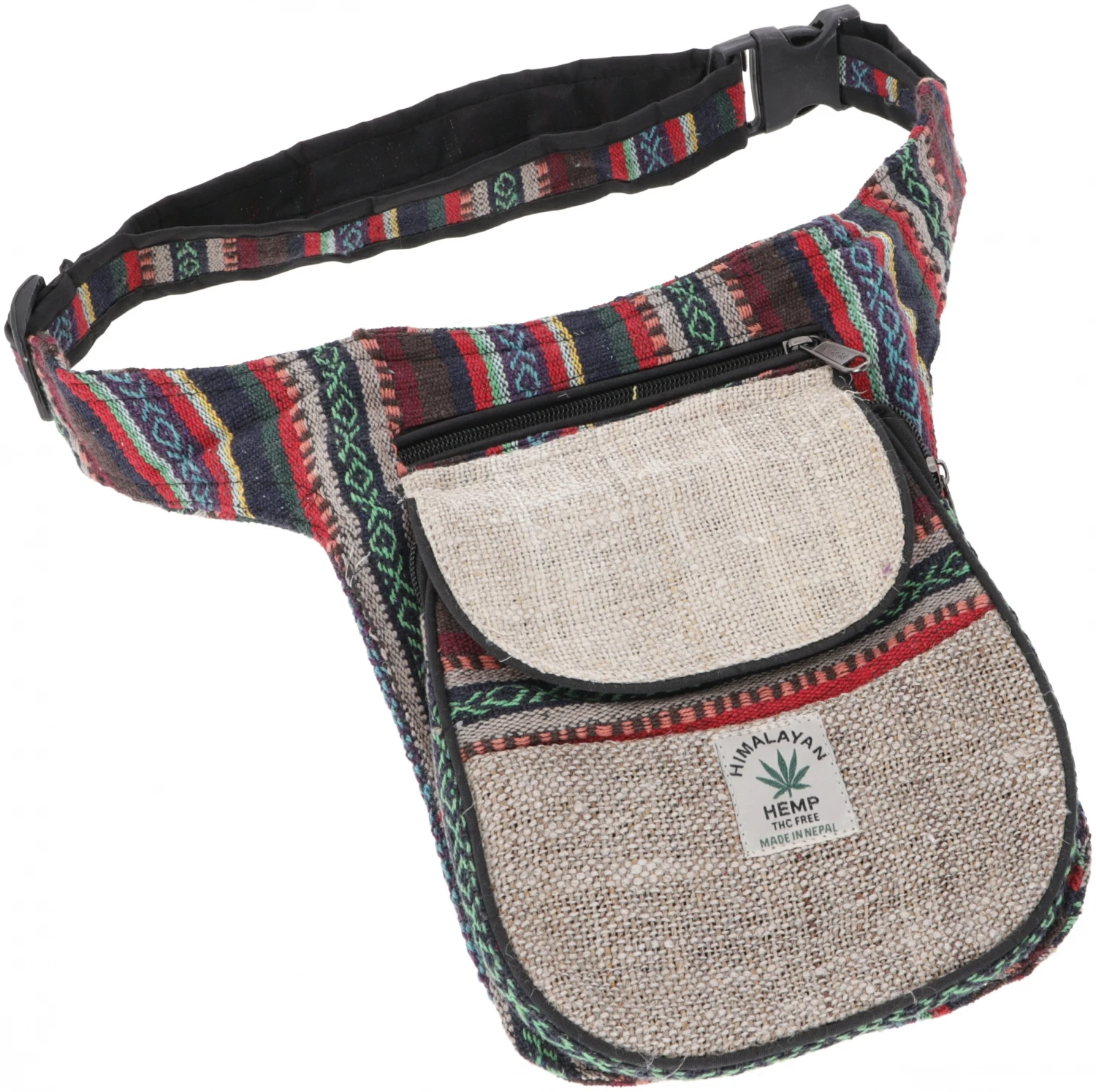 Praktische Gürteltasche aus Hanffaser in Kombination mit traditionellem Webstoff aus Nepal.