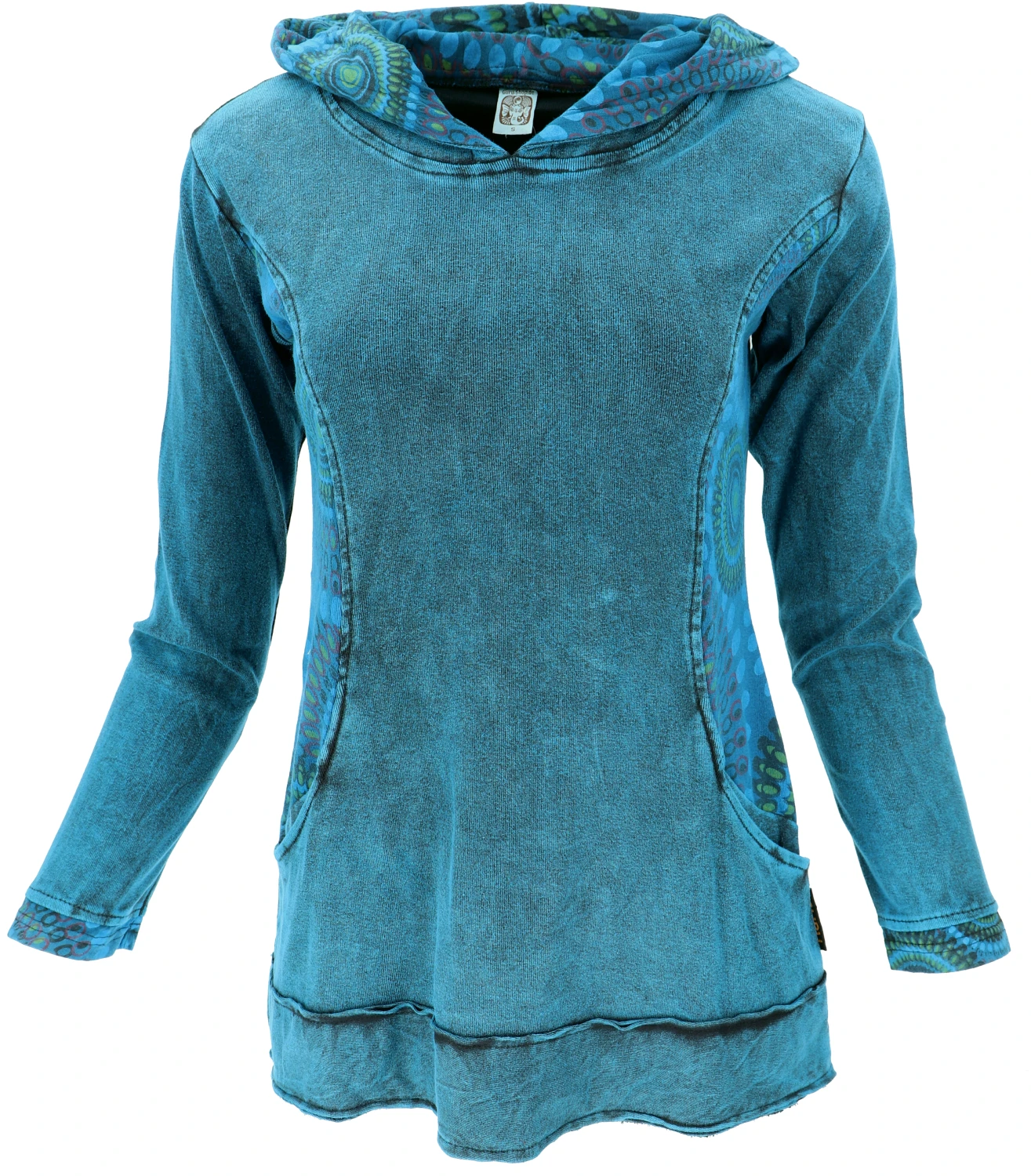 Weiches, farblich abgesetztes Shirt mit langer Zipfelkapuze und kleinen Taschen. Das extravagante Shirt in seinem Used- Stonewash Look ist super zu kombinieren und mit seinen feinen ein unübersehbares Statement. Die lange Kapuze ist farblich passend gefüttert. Am Bund gibt es extra Overlocknähte.