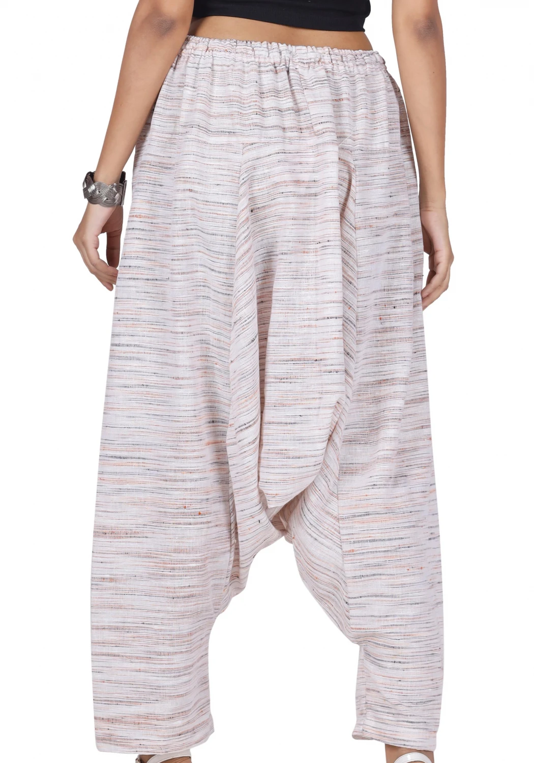 Bequeme Pluderhose mit elastischem Bund und Kordelzug. Toller natürlicher Look durch den traditionell gewebten Kadhistoff. Die Hose hat links und rechts geräumig Hosentaschen.