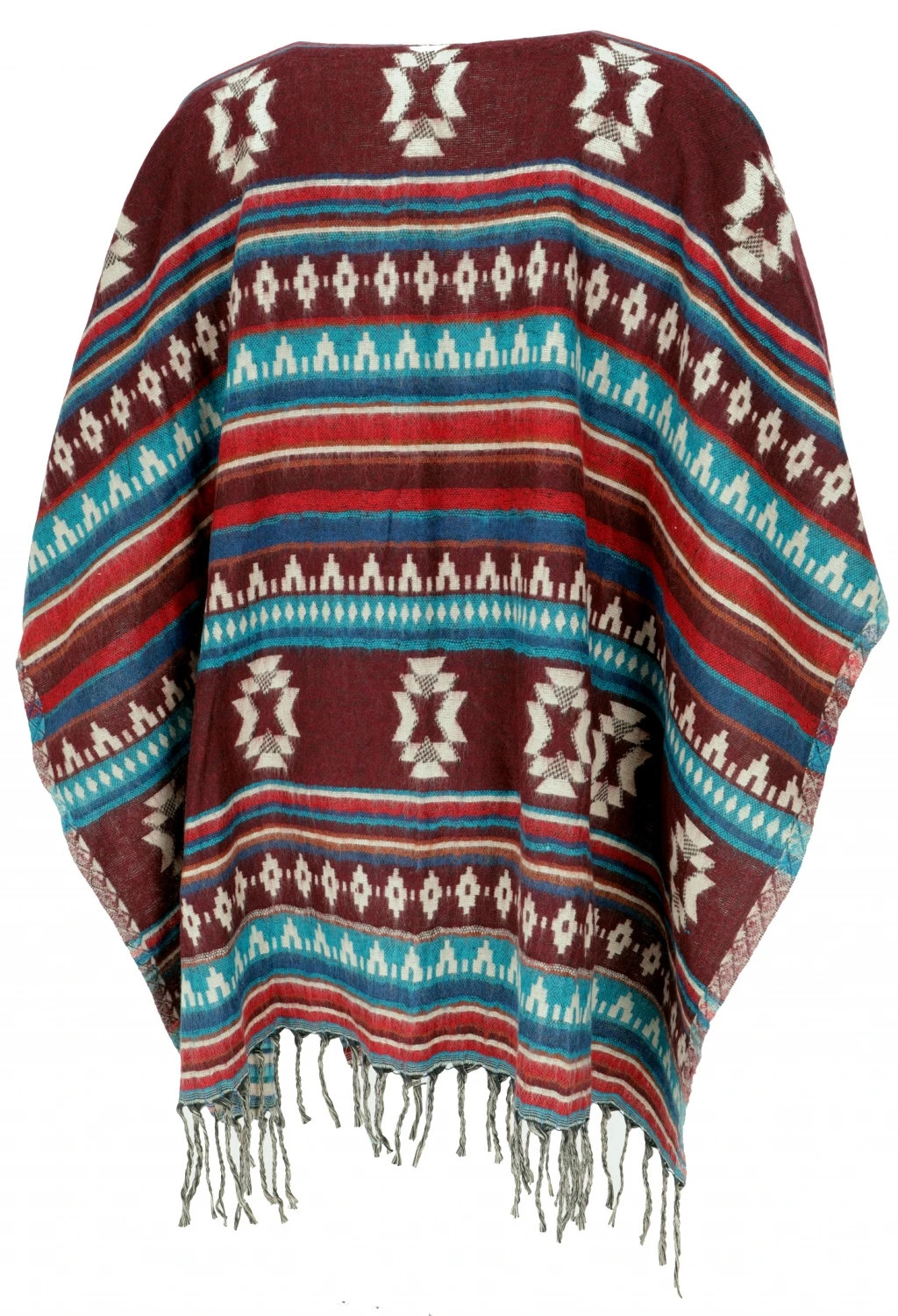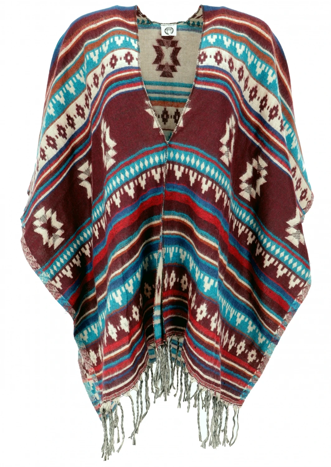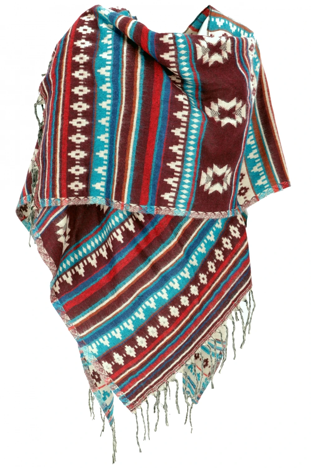 Weicher Boho-Poncho mit traditionellem Inkamuster. Das flauschige Material fällt locker und umschmeichelt die Figur. Schnell und chic ist man gegen Kälte geschützt. Einfach um die Schulter gelegt und nach belieben locker fallen lassen oder aber um den Hals drapieren.