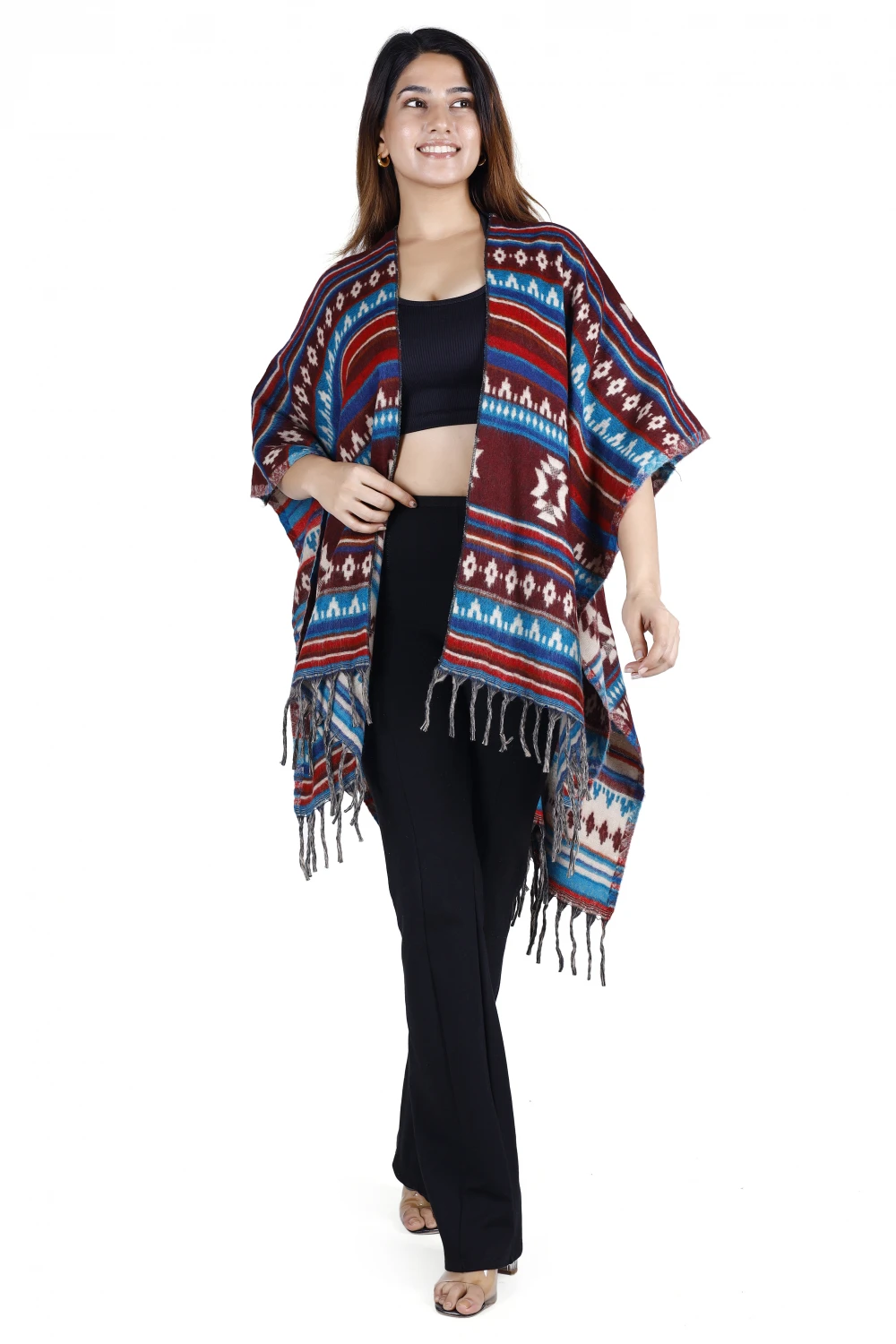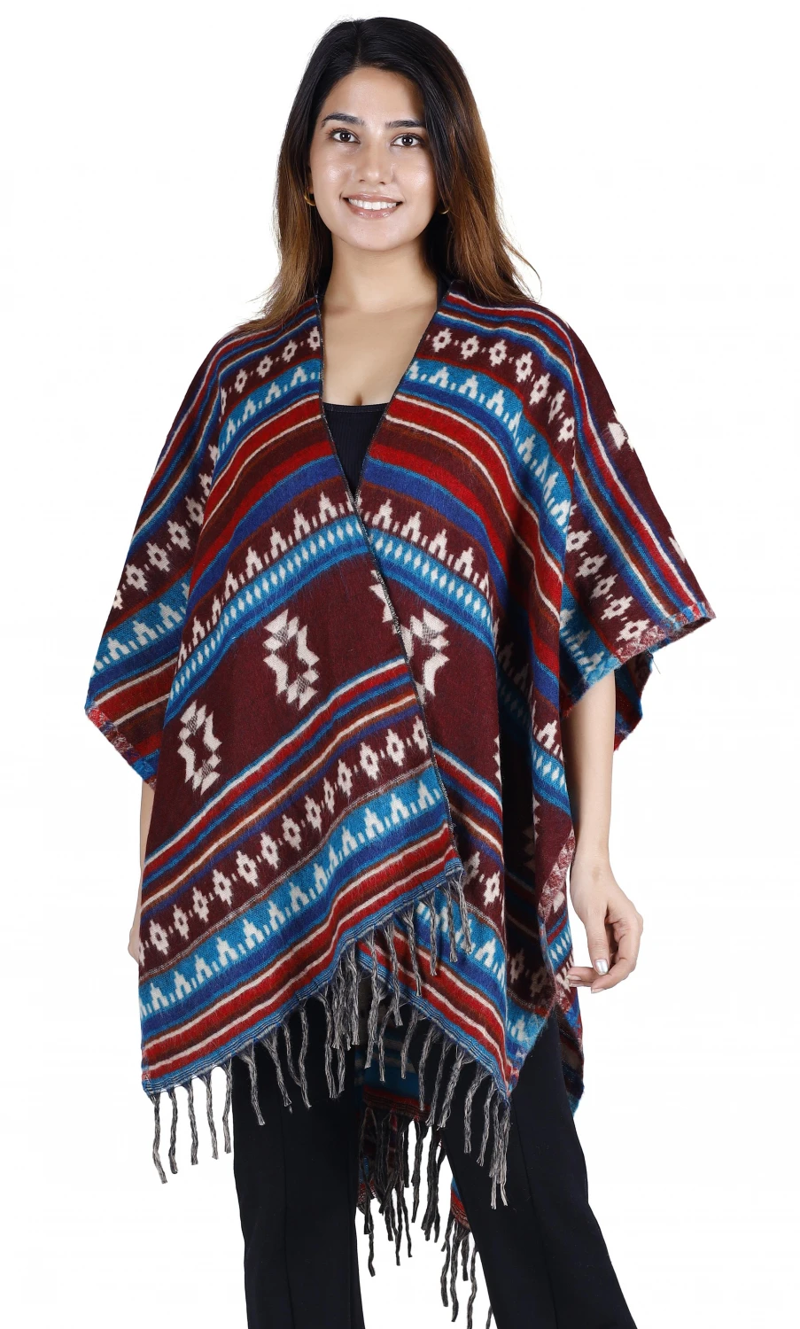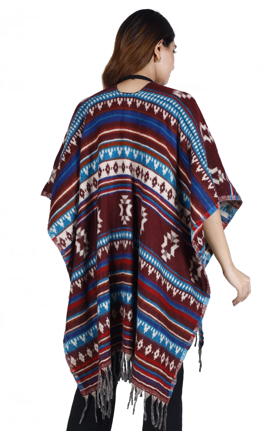 Weicher Boho-Poncho mit traditionellem Inkamuster. Das flauschige Material fällt locker und umschmeichelt die Figur. Schnell und chic ist man gegen Kälte geschützt. Einfach um die Schulter gelegt und nach belieben locker fallen lassen oder aber um den Hals drapieren.