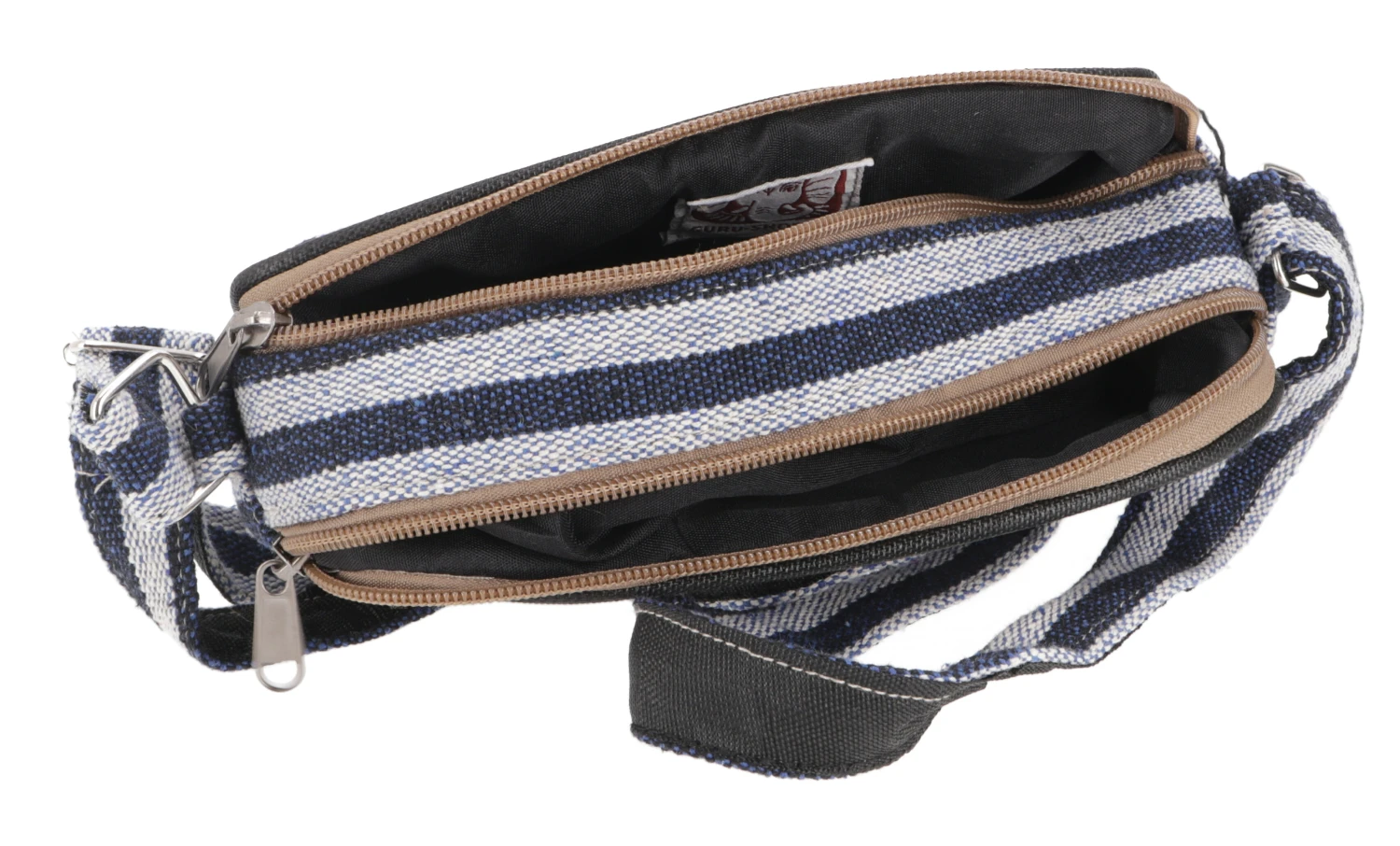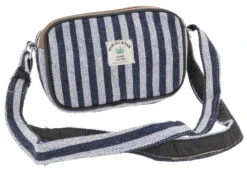 Kleine Schultertasche mit verstellbarem Tragegurt und zwei Reißverschlussfächern. Der feste Stoff mit Streifenmuster wurde traditionell von Hand gewebt. Das moderne Design im Öko-Schick passt zu fast jedem Outfit. Die Taschen werden von Hand gefertigt. Jede ist ein Unikat und kann deshalb leicht von der Abbildung abweichen.