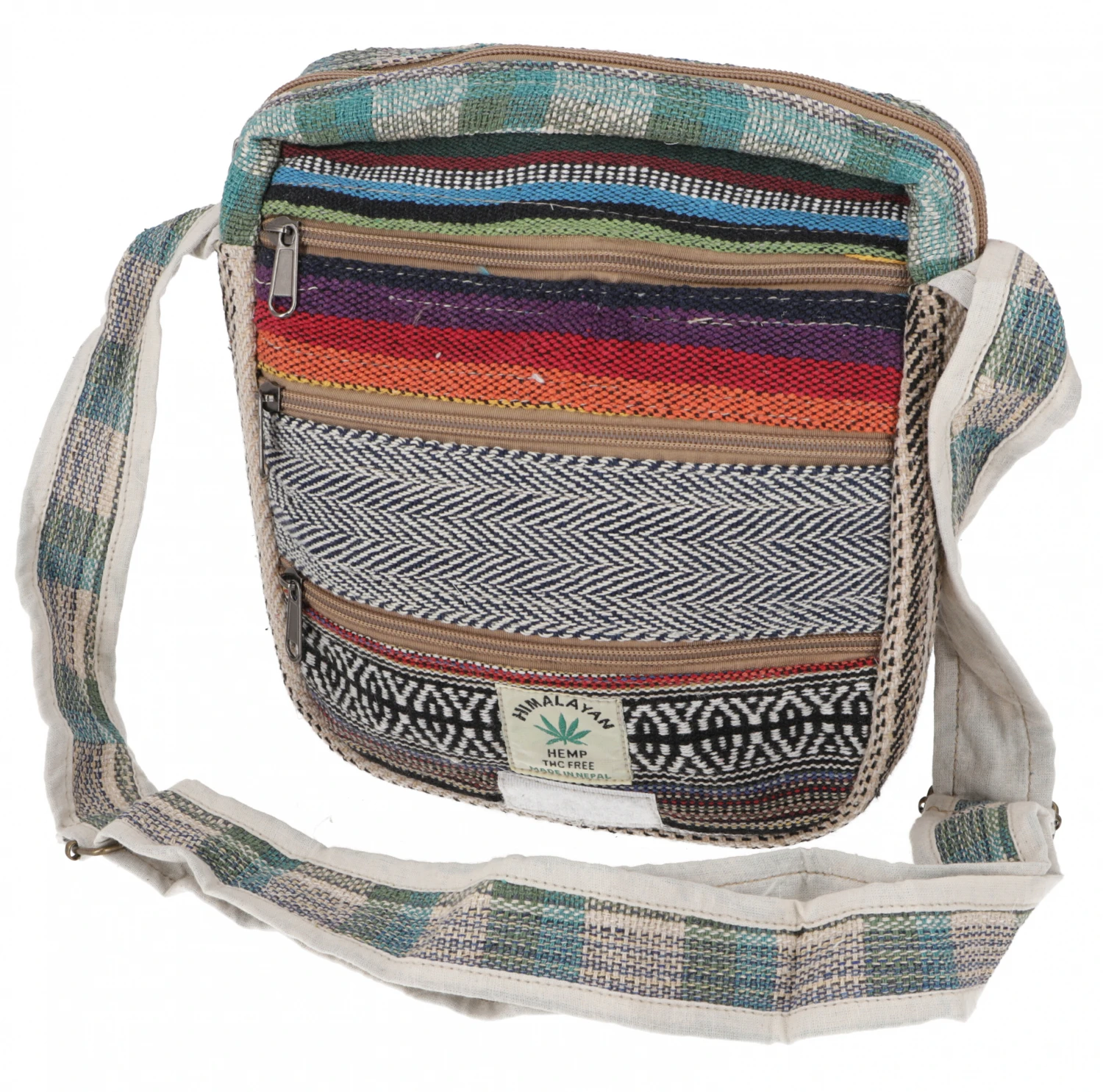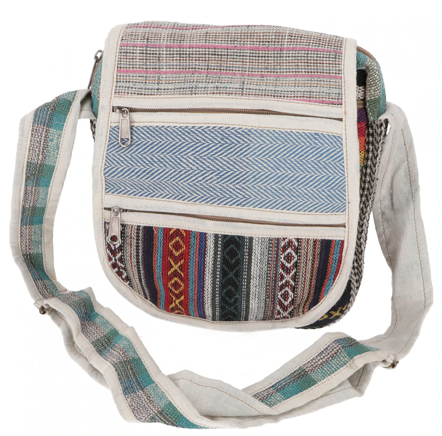Tolle Schultertasche aus natürlichem, traditionell gefertigtem Baumwoll-Hanf-Mix. Auf und unter dem Deckel sind insgesamt fünf einzelne Reißverschlussfächer in denen man alles sehr gut separat verstauen kann. Das Hauptfach ist einfach ausgestattet. Der kleine, praktische Schulterbeutel besticht durch sein umweltfreundliches Material und ist eine Hommage an die Natur. Jede Tasche ist ein mit Sorgfalt von Hand gefertigtes Unikat, entspricht aber in etwa den abgebildeten Beispielen.