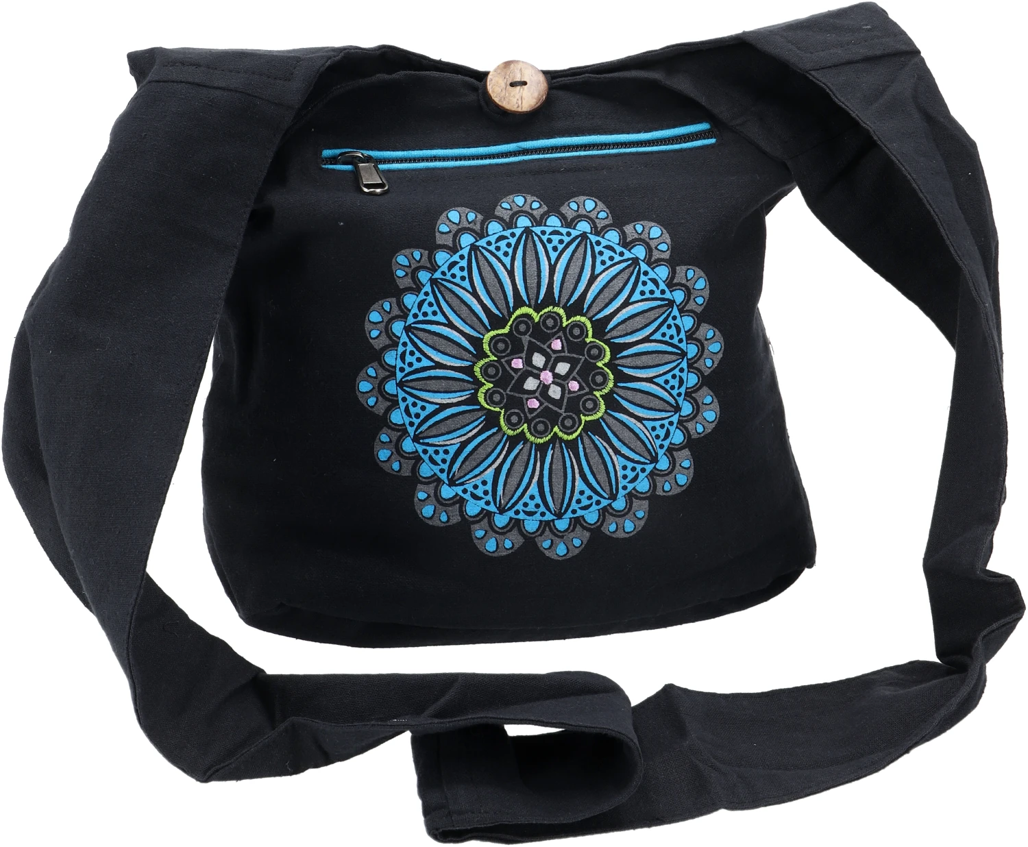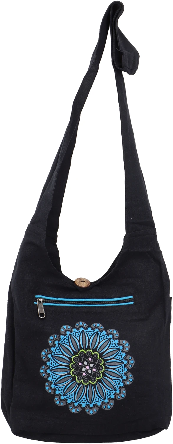 Schöne Schultertasche aus Baumwolle mit einzigartigem Mandala Druck. Das Druckmuster wird durch Stickereien farblich hervorgehoben. Die Tasche hat ein großes Hauptfach, ein Fach über dem Gedruckten und einem im inneren der Tasche. Alle drei sind mit einem Reißverschluss versehen. Zusätzlich kann man das Hauptfach mit einem dekorativen Kokosknopf verschließen.