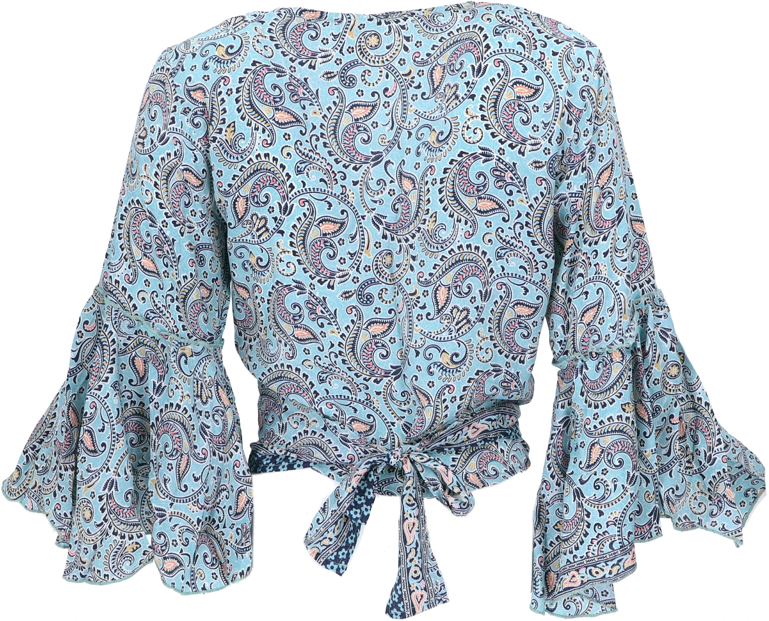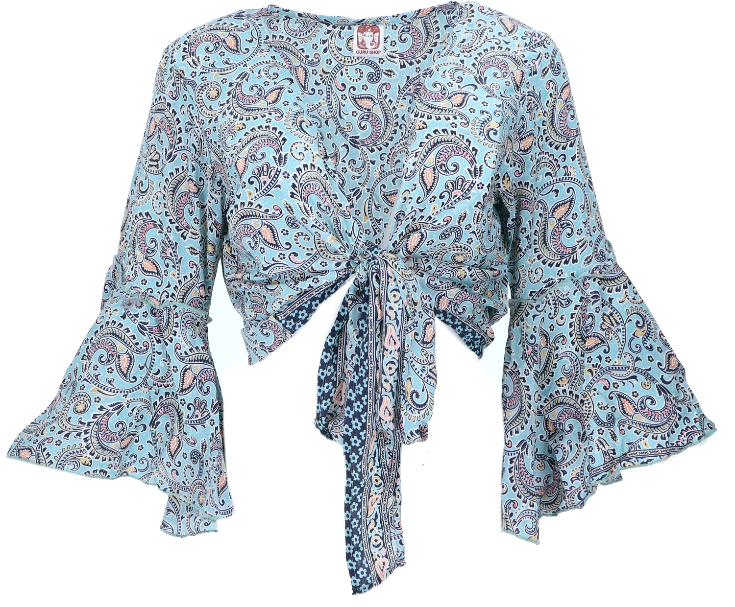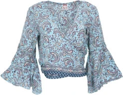 Wunderschön leichtes, seidiges Boho-Top mit weit ausgestellten Ärmeln für heiße Tage. Für diese schöne Wickelbluse haben wir den glänzenden Stoff indischer Sarees verwandelt. Wie ein Hauch fühlt sich dieses schöne, vielseitig tragbare Top an, dass sich super kombinieren lässt.