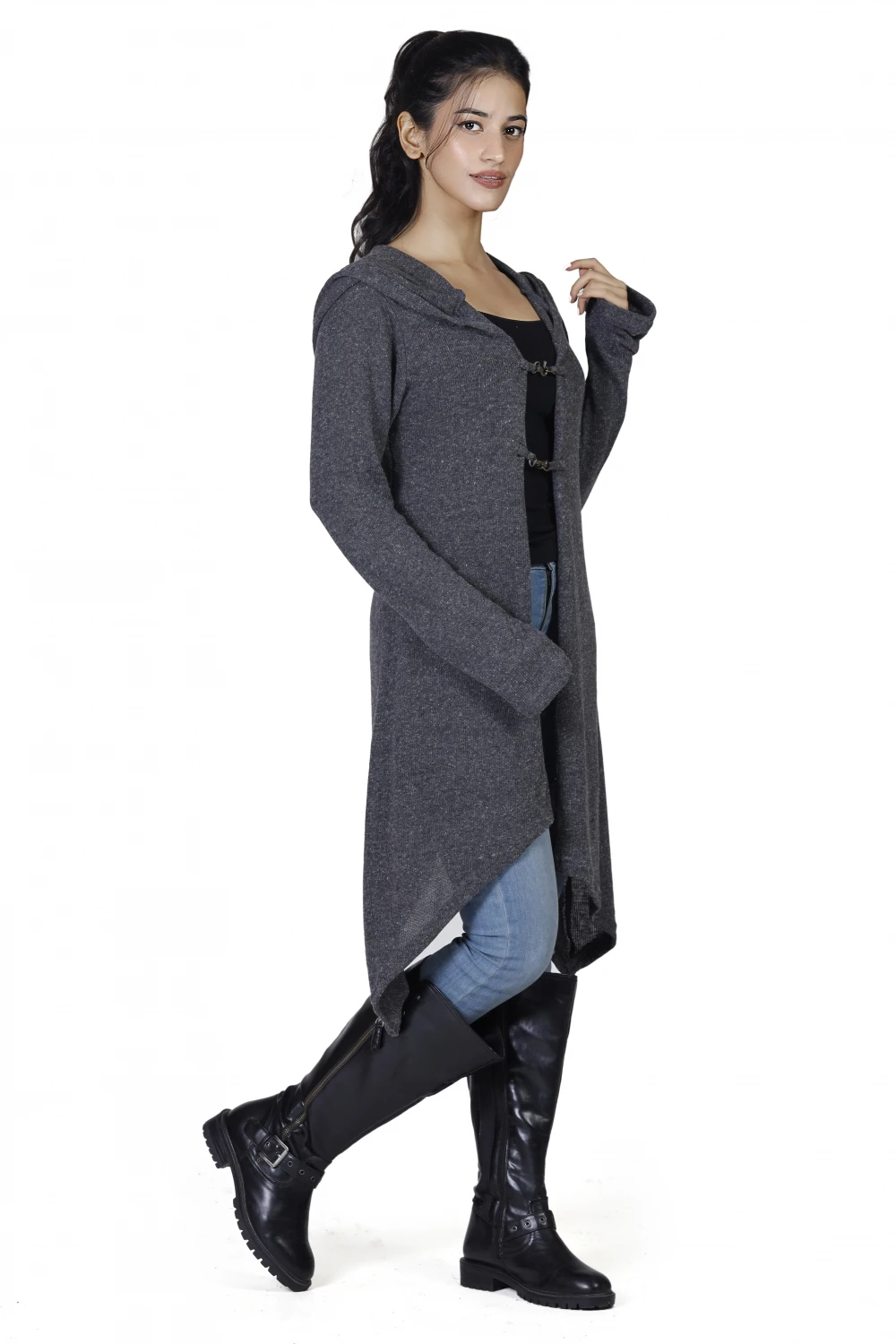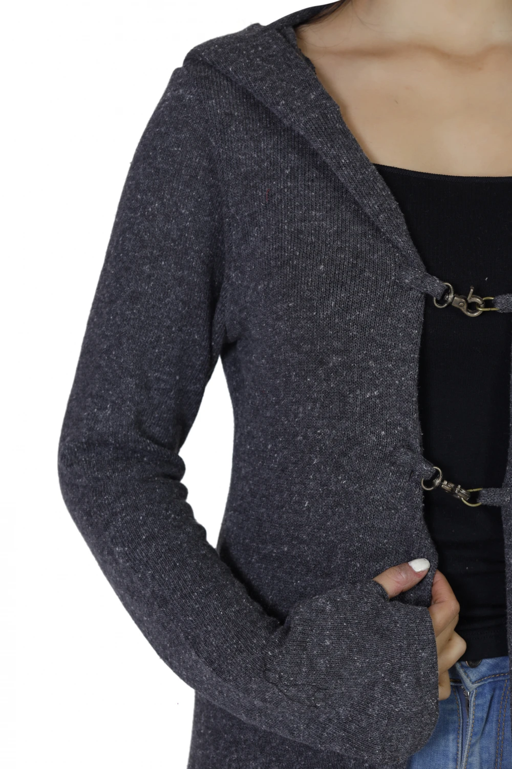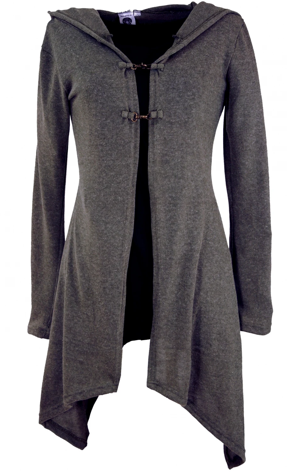 Legere Strickjacke mit übergroßer Kapuze. Die Jacke wird mit kleinen Hakenösen geschlossen. Das natürliche Material aus Baumwoll-Strick umschmeichelt die Figur und ist sehr angenehm zu tragen.