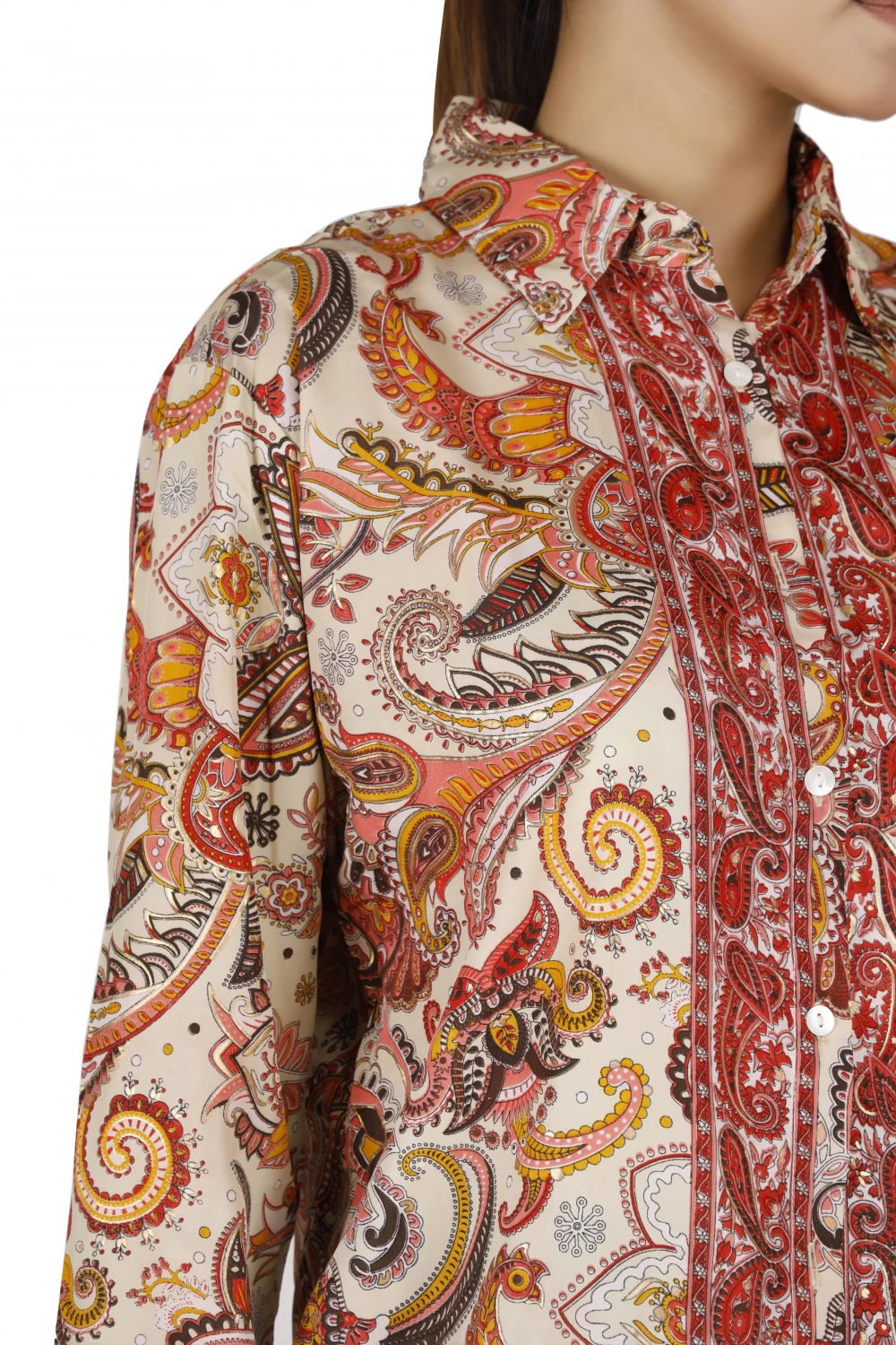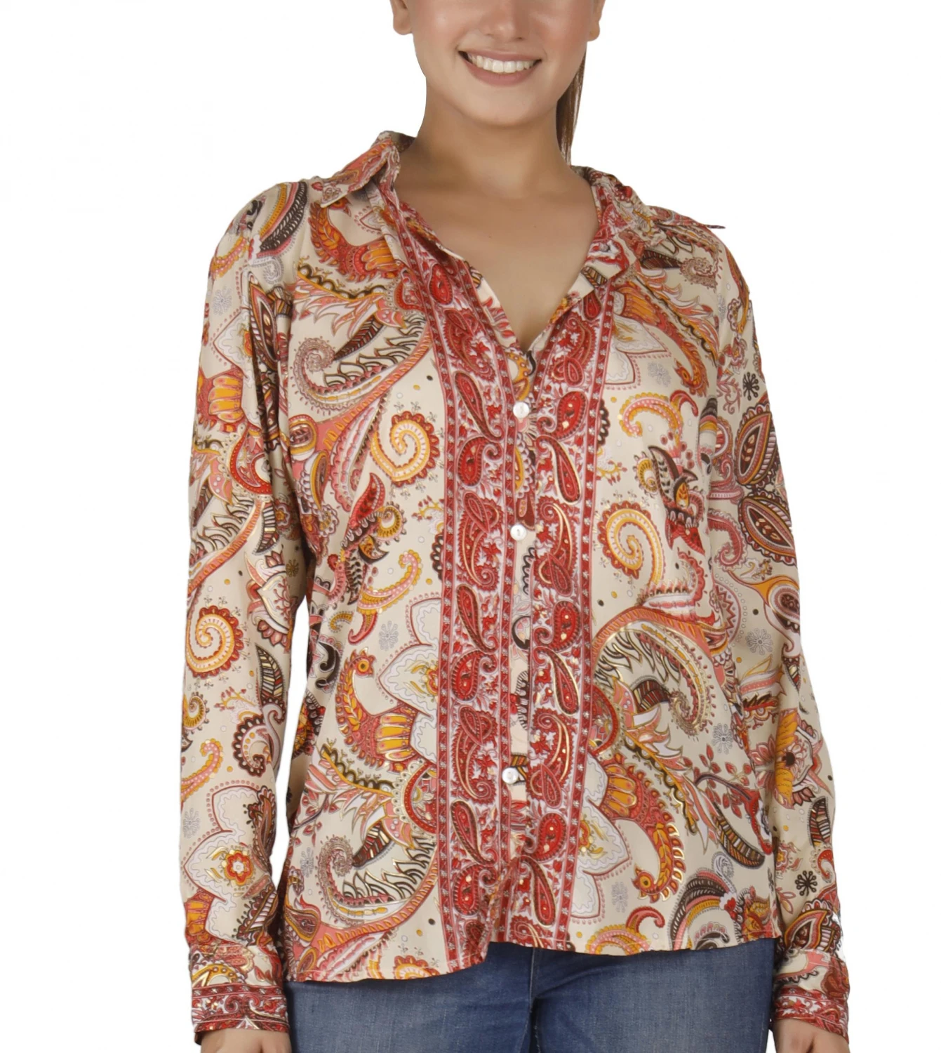 Fließend fallende, luftig leichte Hemdbluse aus seidig glänzendem Material. Das Hemd kann offen, geschlossen oder gebunden getragen werden. Die kleinen Knöpfe schimmern edel auf den orientalisch anmutenden Mustern.