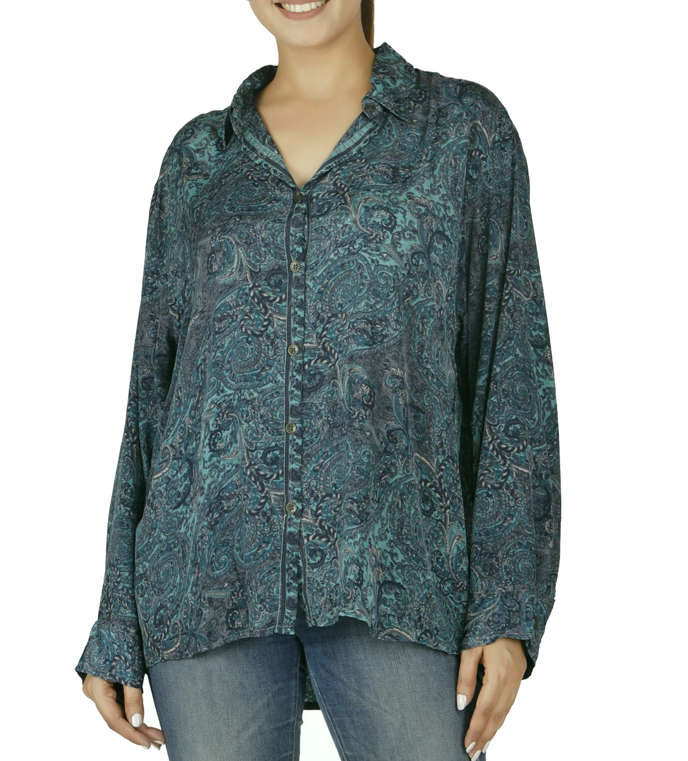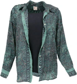 Fließend fallende, luftig leichte Hemdbluse aus seidig glänzendem Material. Das Hemd kann offen, geschlossen oder gebunden getragen werden.