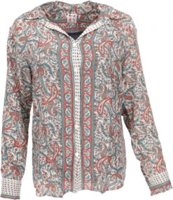 Fließend fallende, luftig leichte Hemdbluse aus seidig glänzendem Material. Das Hemd kann offen, geschlossen oder gebunden getragen werden. Die kleinen Knöpfe schimmern edel auf den orientalisch anmutenden Mustern.