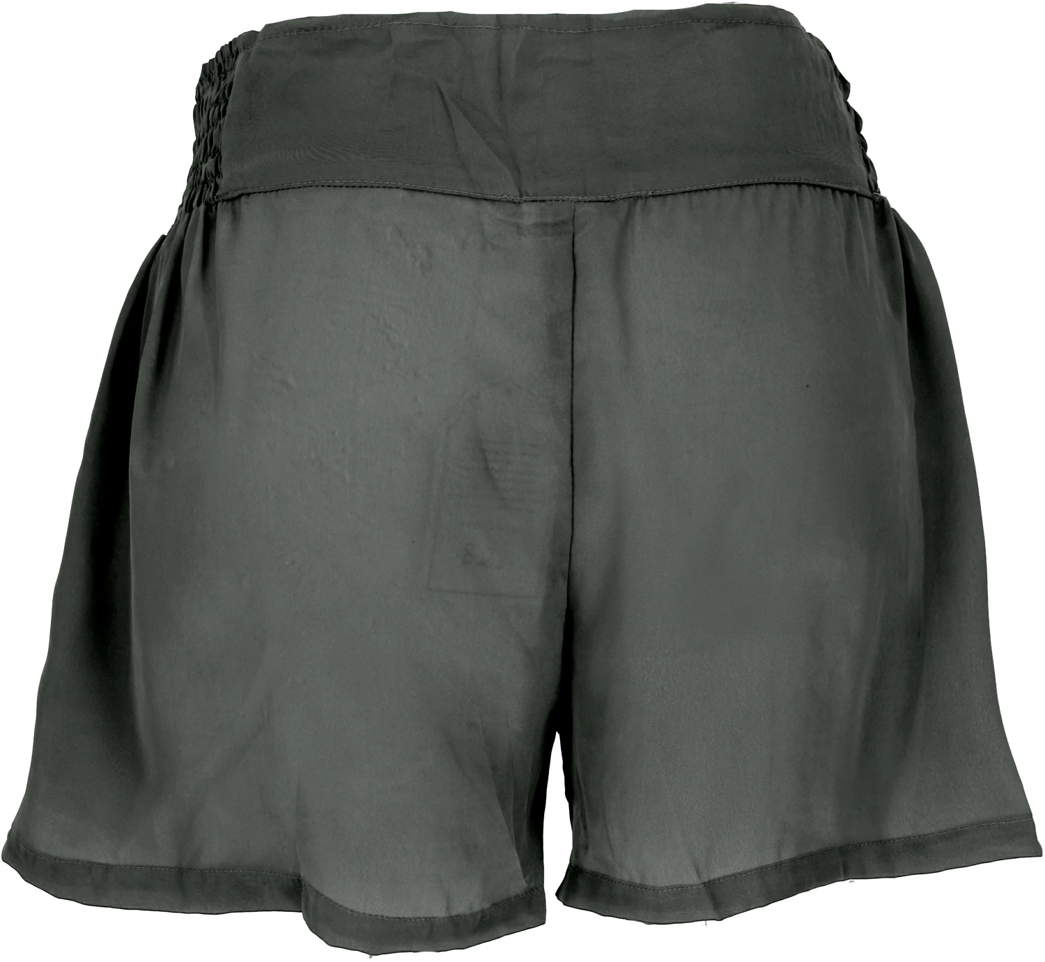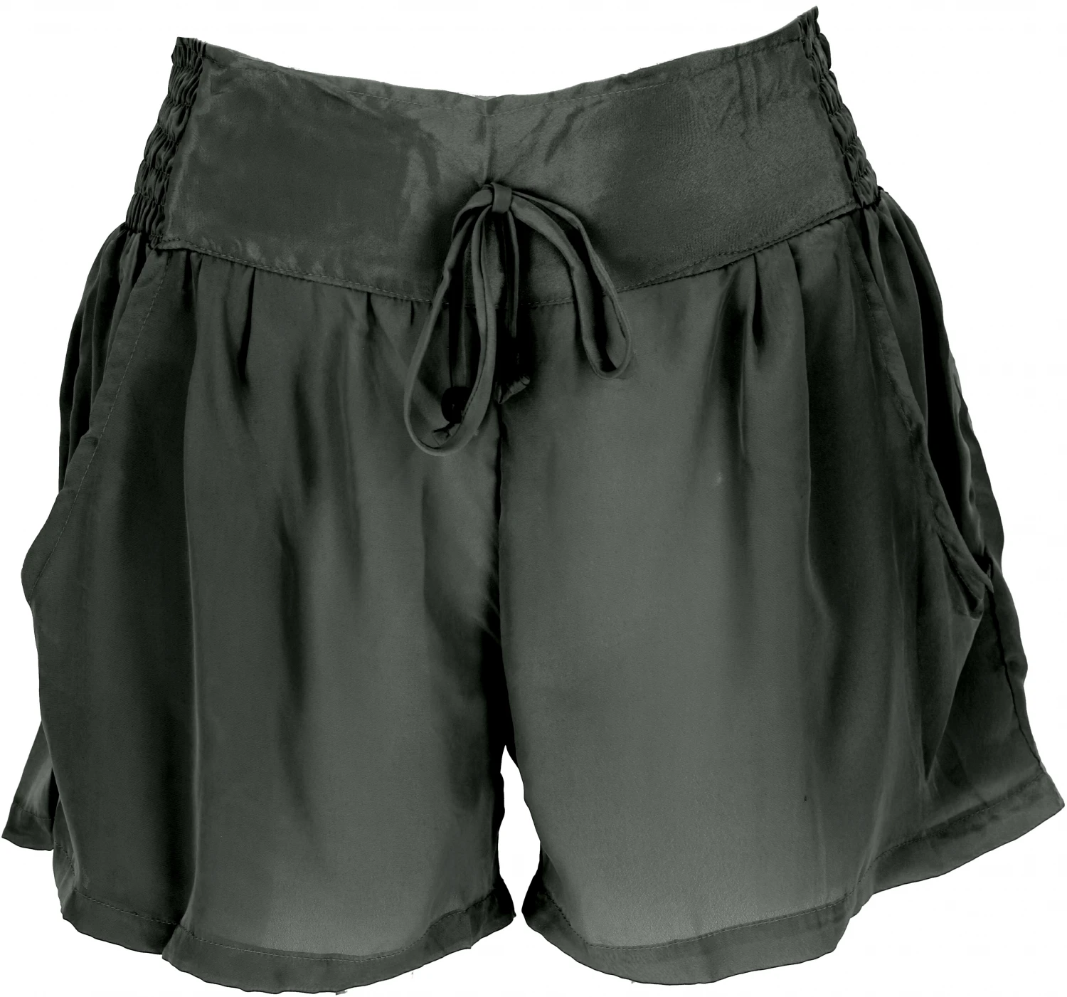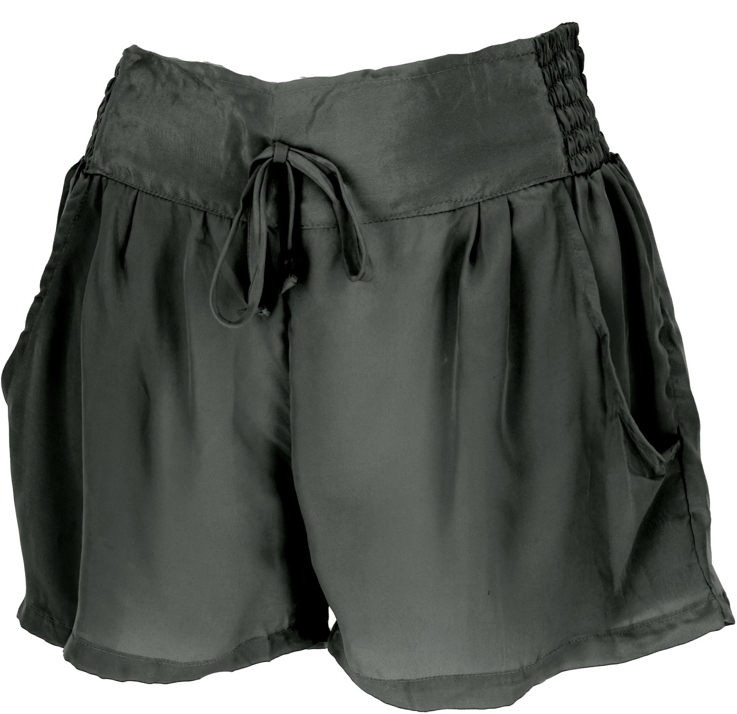 Shorts mit rückseitig elastischem Bund. Die Seiten des elastischen Bundes sind gesmokt. Das Kordelband mit den kleinen Holzmurmeln ist zur Zierde. Seiltlich gibt es zwei Eingriffstaschen. Die luftige locker fallende kurze Hose sollte in der Sommergarderobe nicht fehlen.
