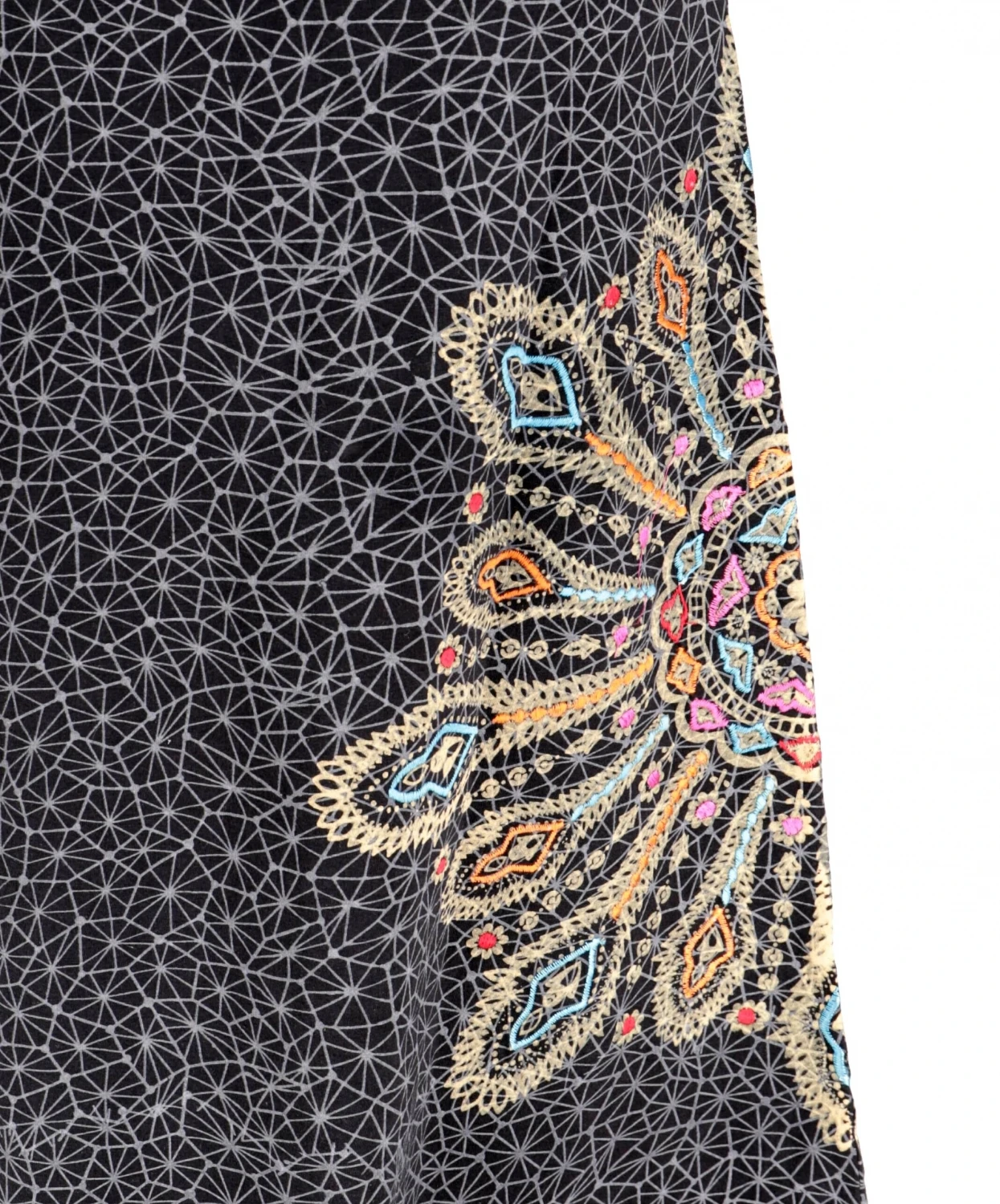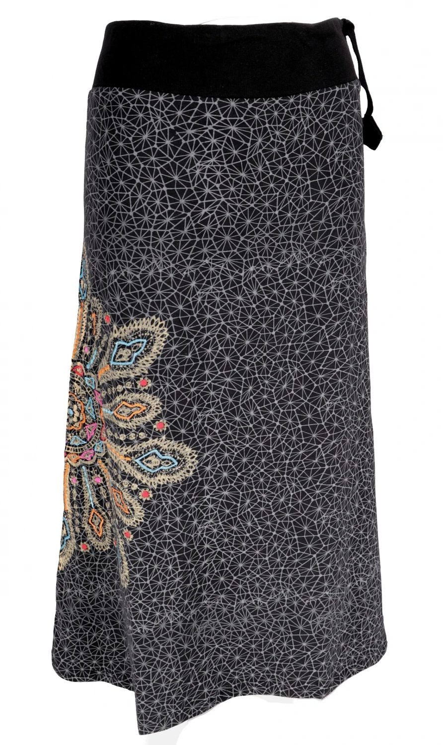 Bequemer Hippierock mit wunderschöner Stickerei auf dezentem Druck. Der elastische Bund ist mit einem Kordelband versehen, durch welches sich die Bundweite leicht regulieren lässt.