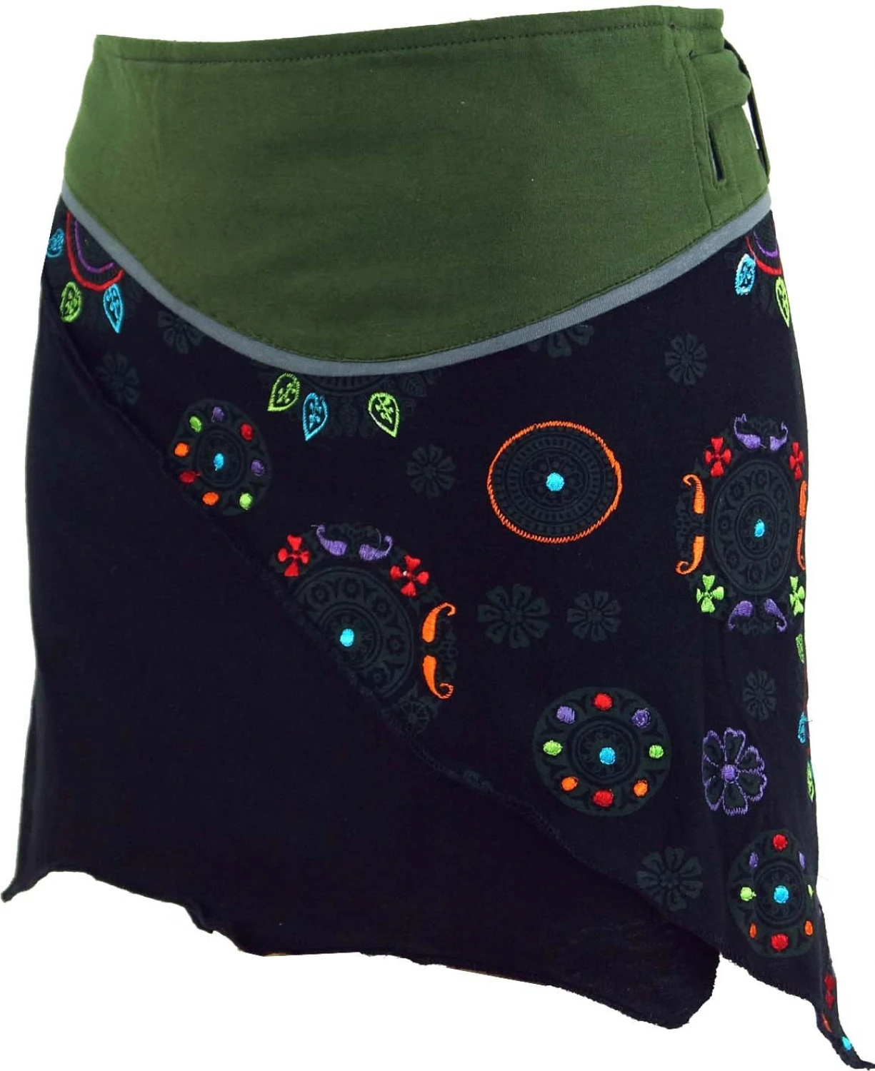 Asymmetrischer Ethno chic Wickelrock mit schönem Druck und aufwendiger Stickerei.