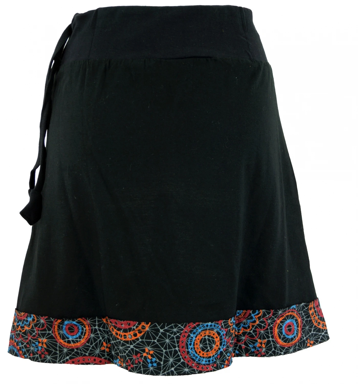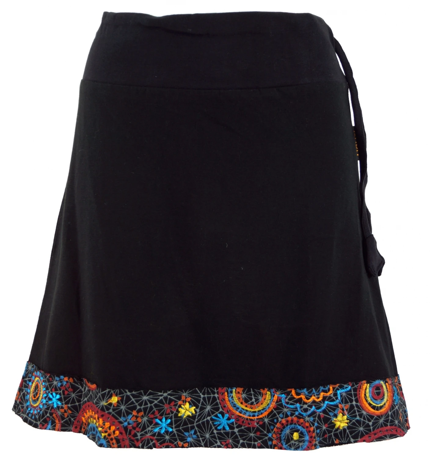 Knielanger Rock aus Nepal mit breitem Saum und Stickerei auf der Vorderseite. Der breite Bund ist elastisch und lässt sich zusätzlich in der Weite mit einem Kordelband regulieren.