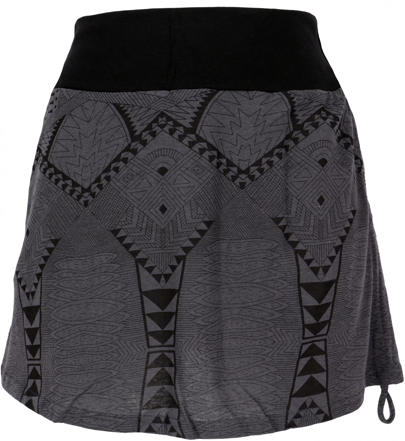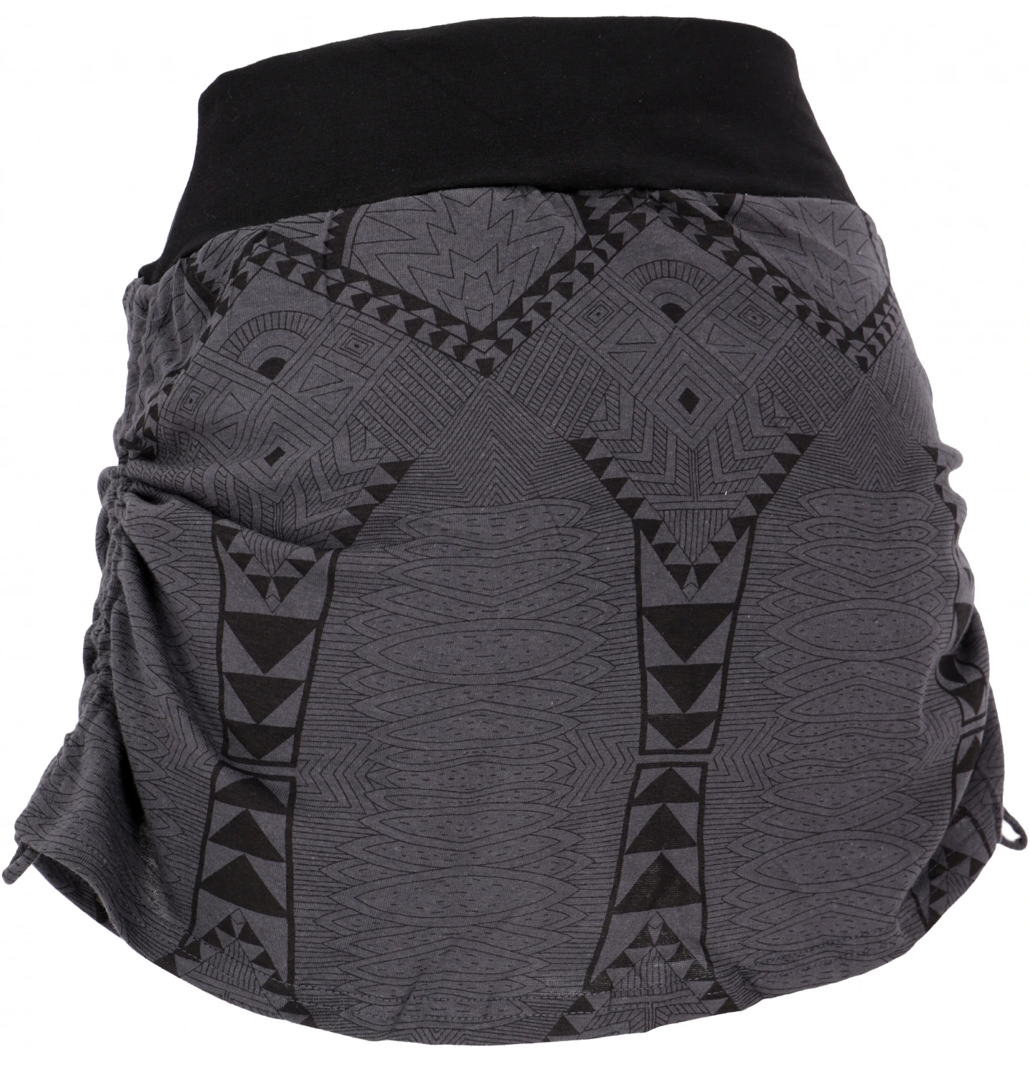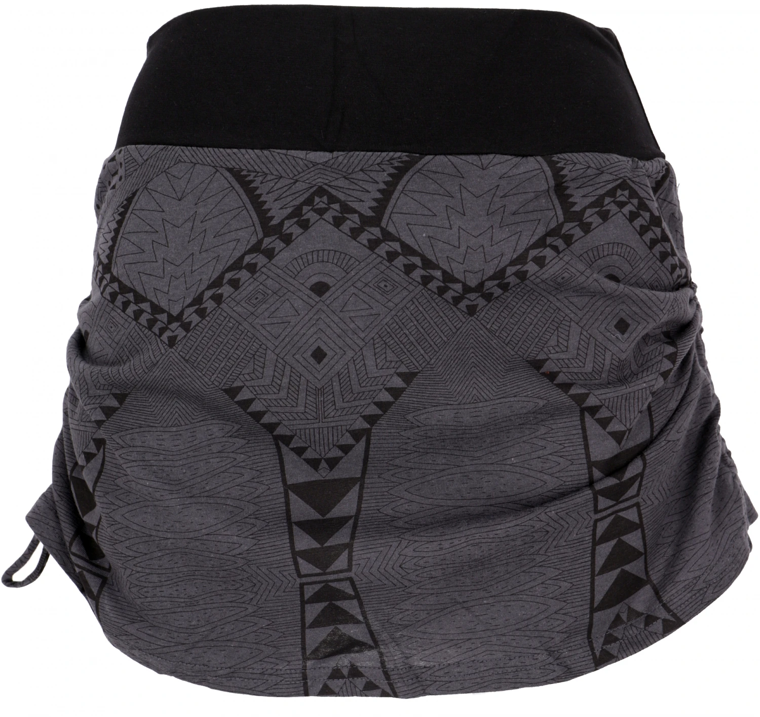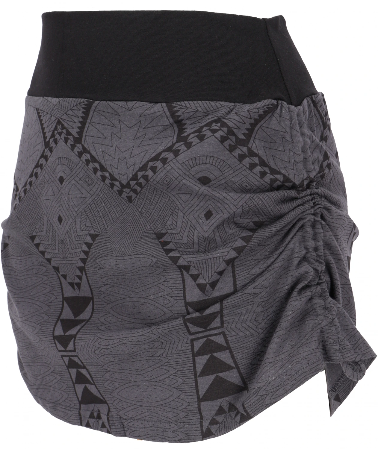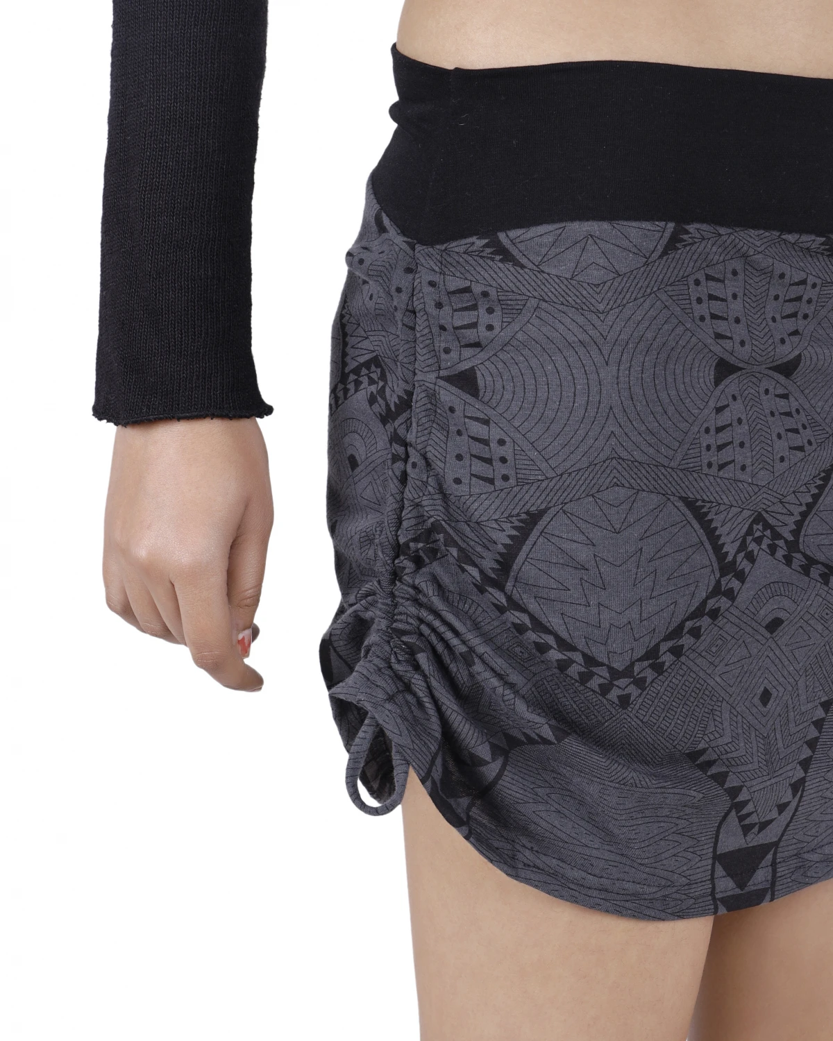 Super kurzer, aufwendig bedruckter Minirock mit elastischem Bund für Alltag, Party oder Yoga, der sowohl an beiden Seiten als auch an nur einer Seite gerafft werden kann.
