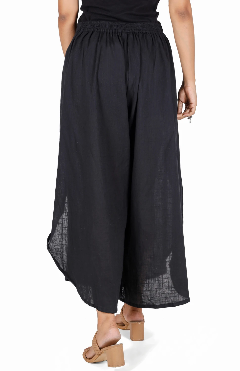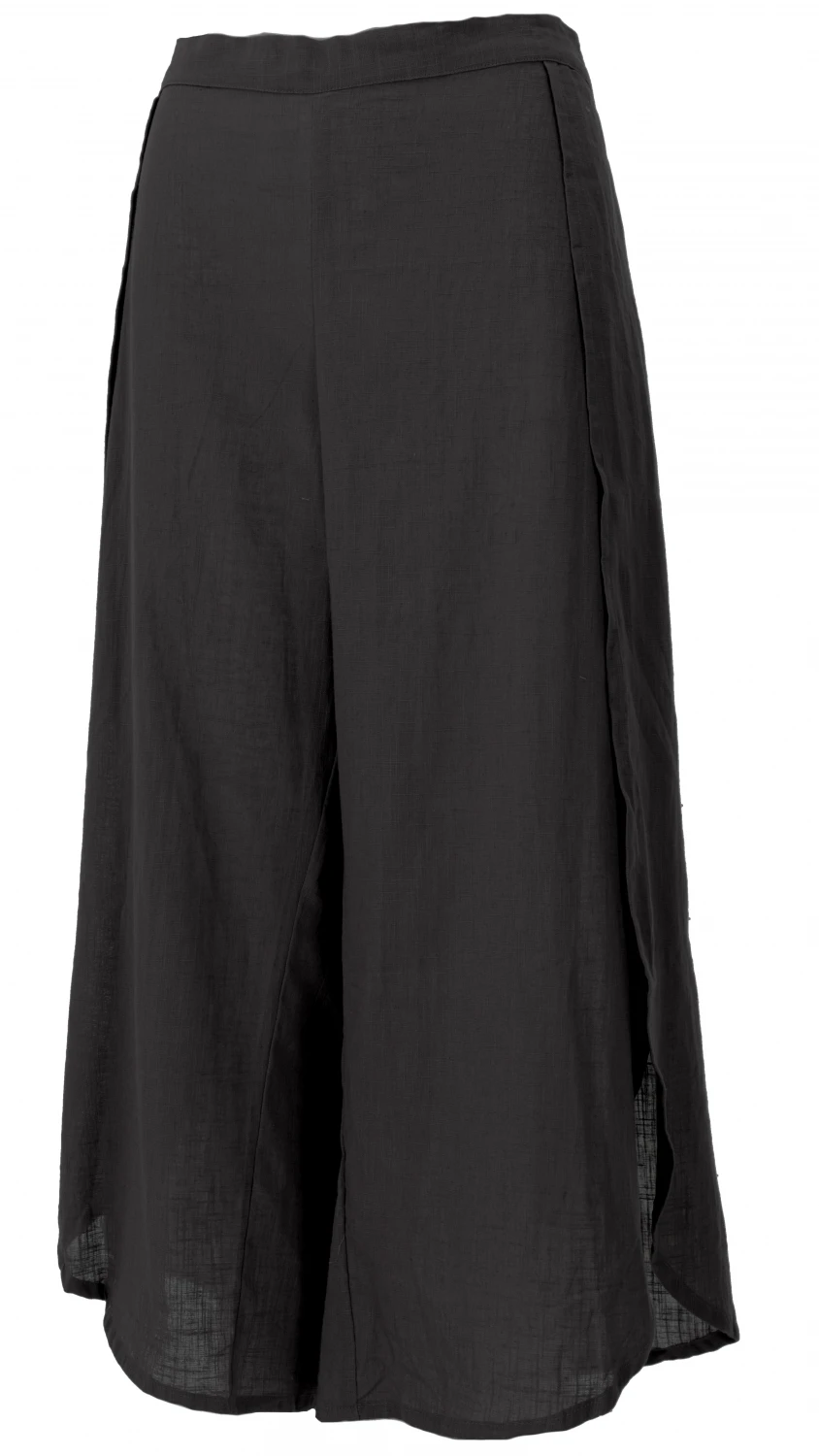 Weite Schlaghose mit rückseitig elastischem Bund. Die sich überlappenden Hosenbeine sind seitlich offen und bieten viel Bewegungsfreiheit.
