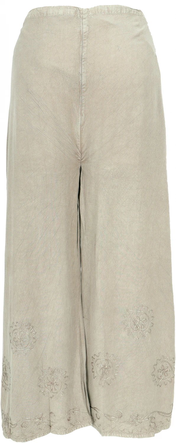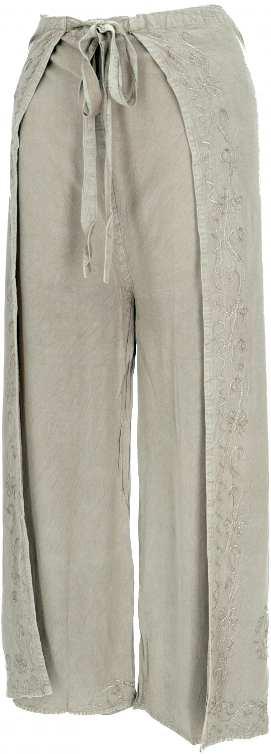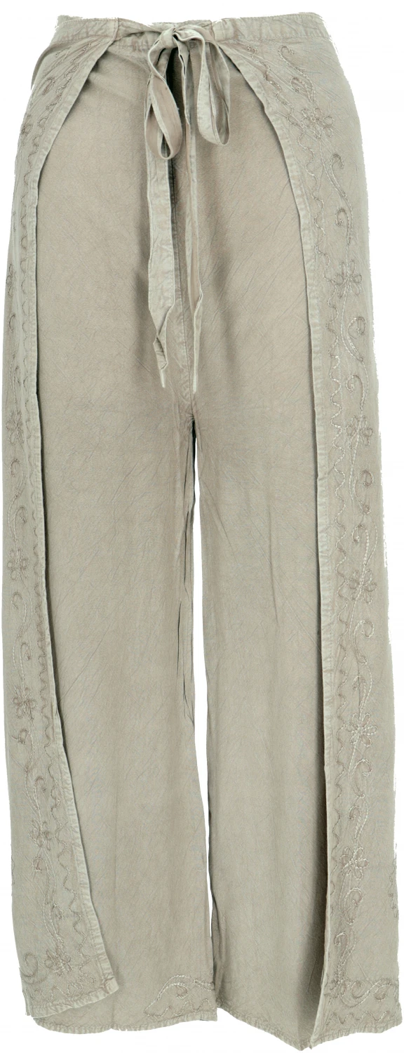 Weite bestickte Wickelhose mit dezenter Stickerei. Die sich überlappenden Hosenbeine sind seitlich offen. Nach Belieben kann man die Hosenbeine hinten oder vorn überlappen lassen. Der Stoff fällt locker und umschmeichelt die Figur. Wunderbare leichte Sommerhose.