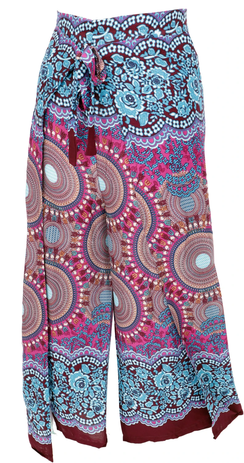 Weite Wickelhose mit schönem Druck. Die sich überlappenden Hosenbeine sind seitlich offen. Nach Belieben kann man die Hosenbeine hinten oder vorn überlappen lassen. Der Stoff fällt locker und umschmeichelt die Figur. Wunderbare leichte Sommerhose.