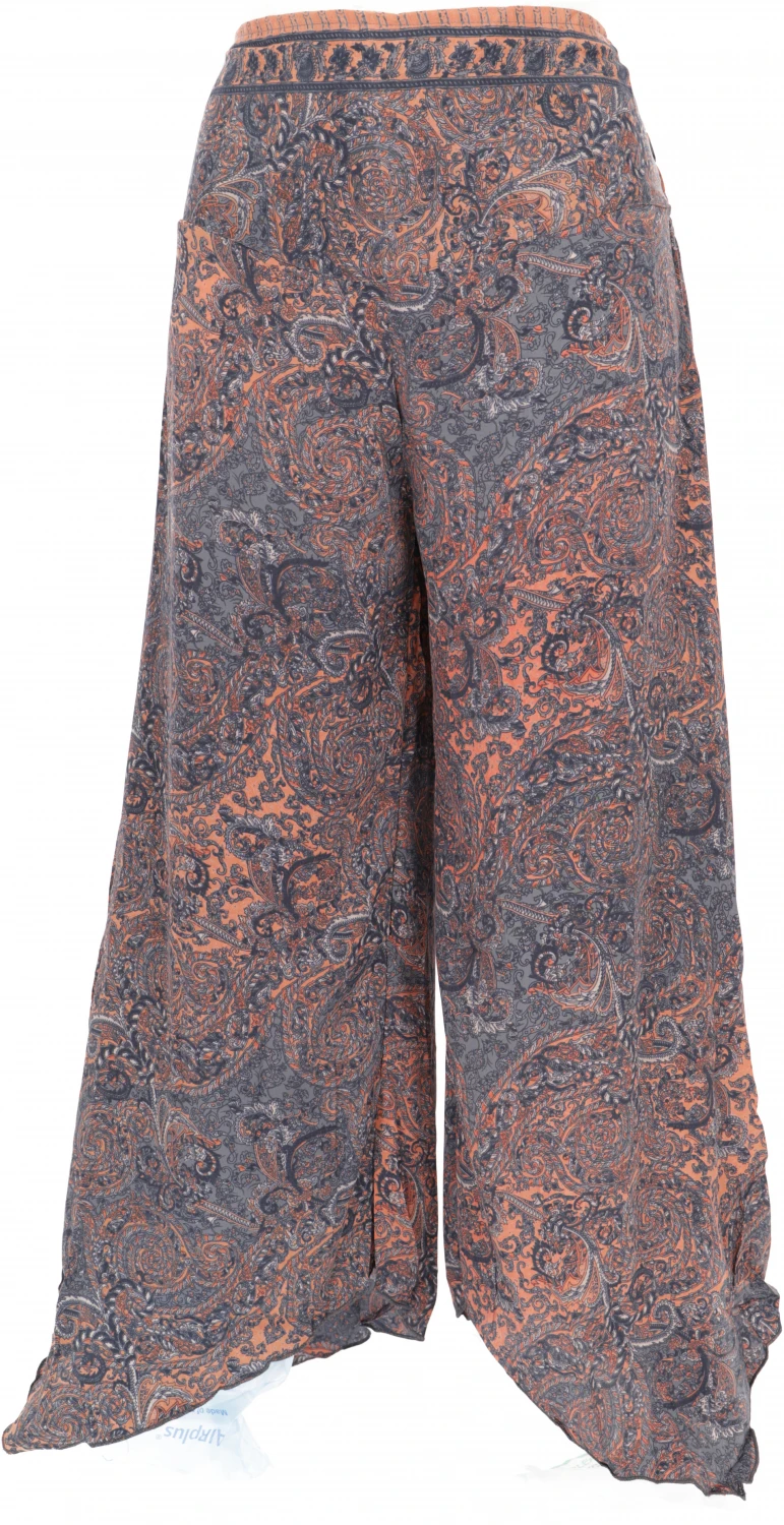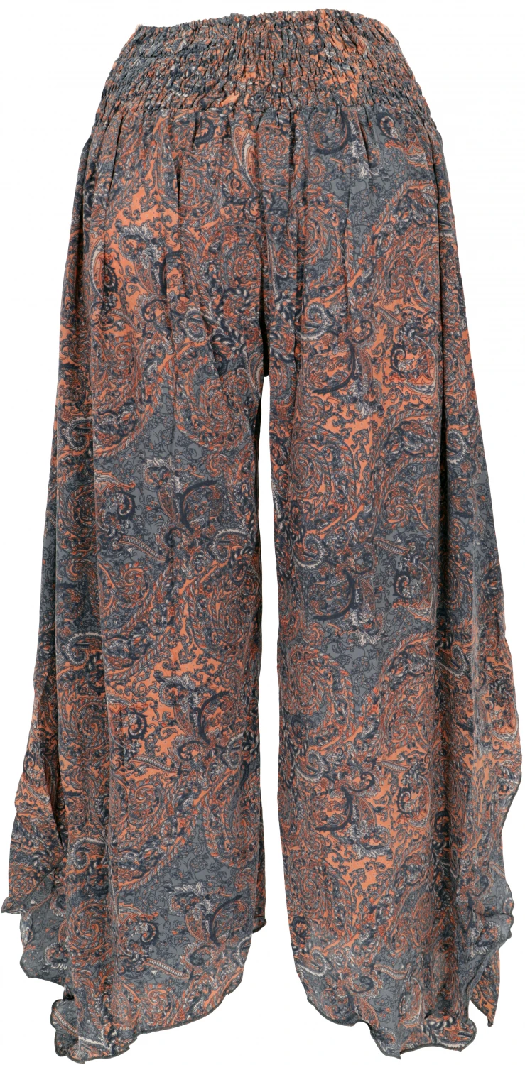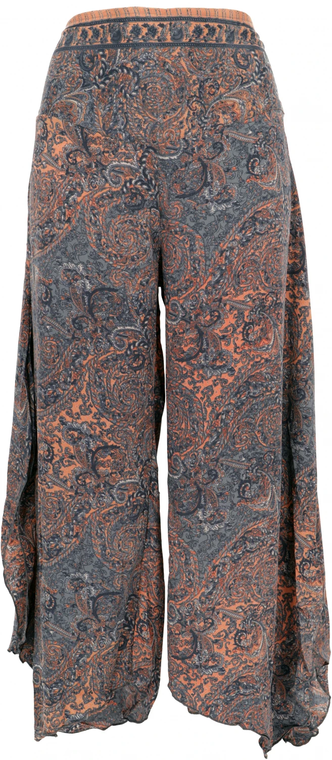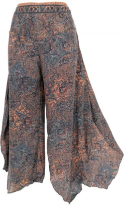 Extraweite Hose mit breitem, hoch geschnittenem elastischem Bund. Die Hosenbeine sind weit und seitlich geschlitzt. Luftig leicht, mit orientalischem Muster umschmeichelt die Hose die Figur und ist ein absolutes Highlight fürs Sommeroutfit.