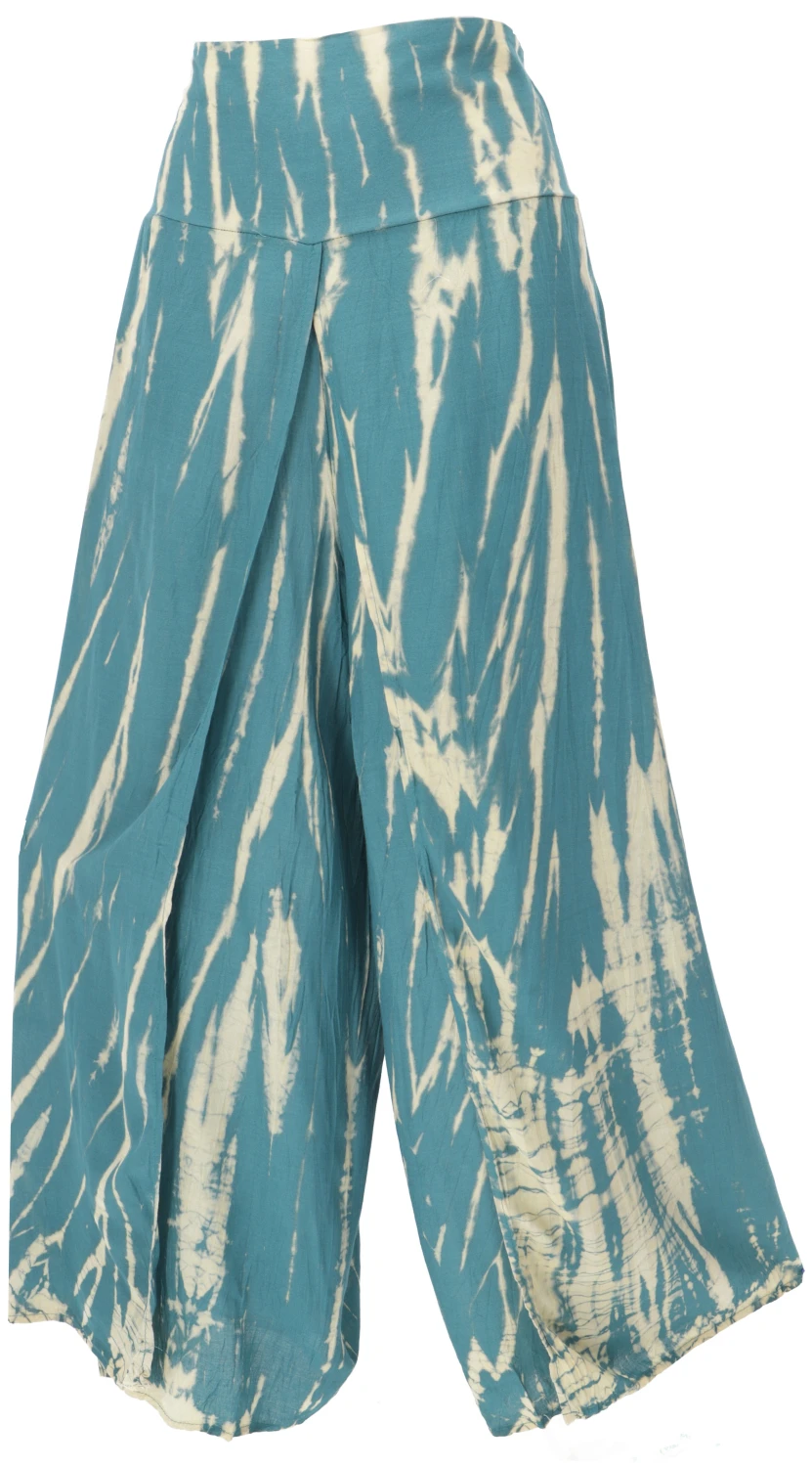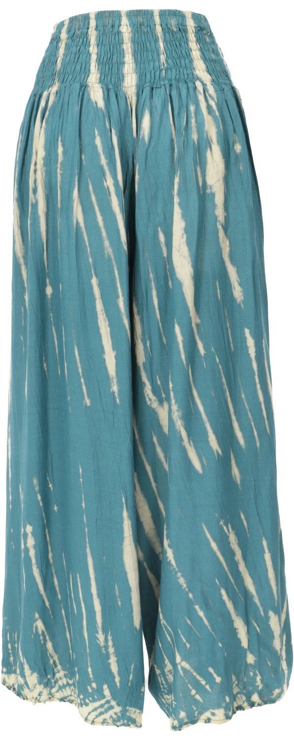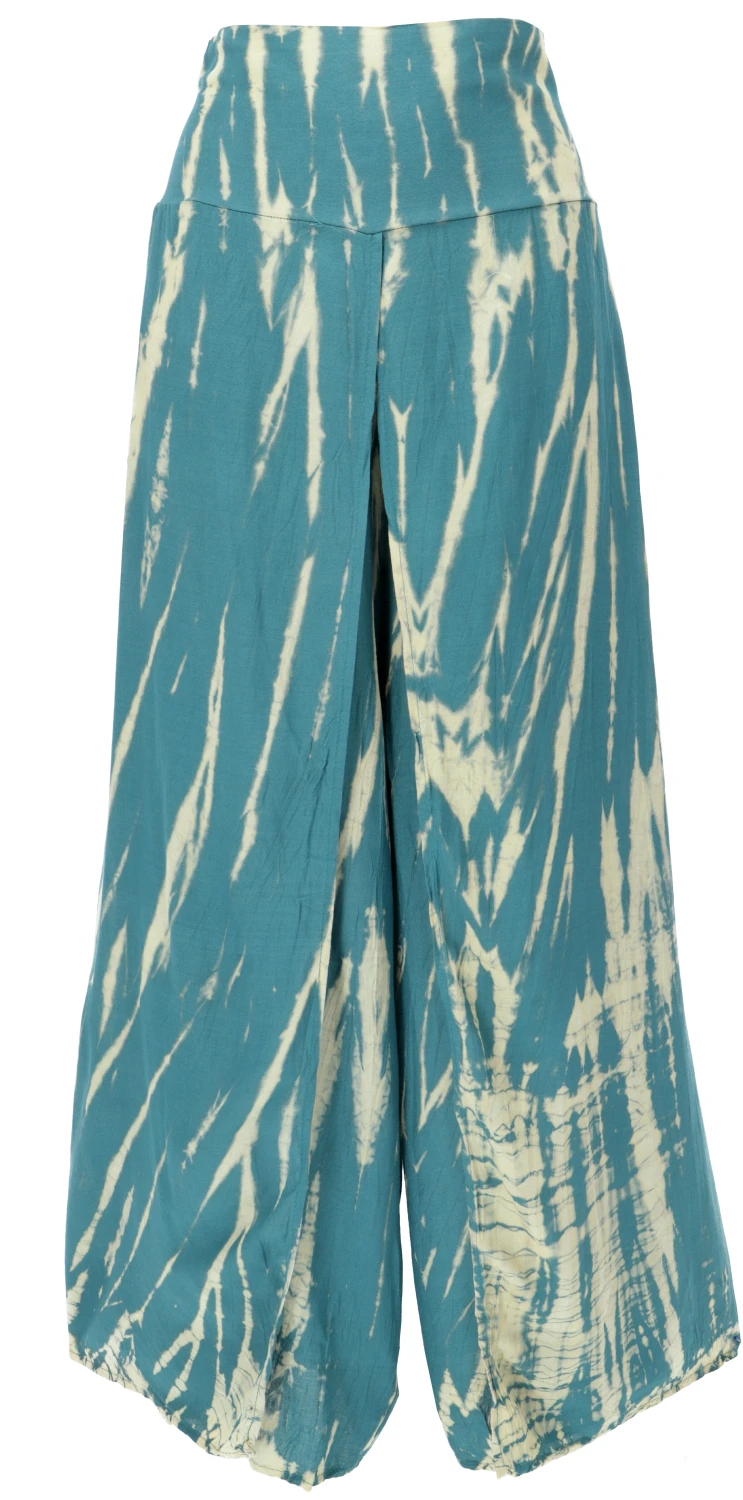 Extraweite Hose mit breitem, hoch geschnittenem elastischem Bund. Die Hosenbeine sind weit und überlappen wie bei einer Wickelhose. Luftig leicht umschmeichelt diese Hose die Figur und ist ein absolutes Highlight für das Sommeroutfit. Die handgefertigte Batik ist ganz individuell und macht jede Hose zu einem einzigartigen Unikat, das leicht von der Abbildung abweichen kann.