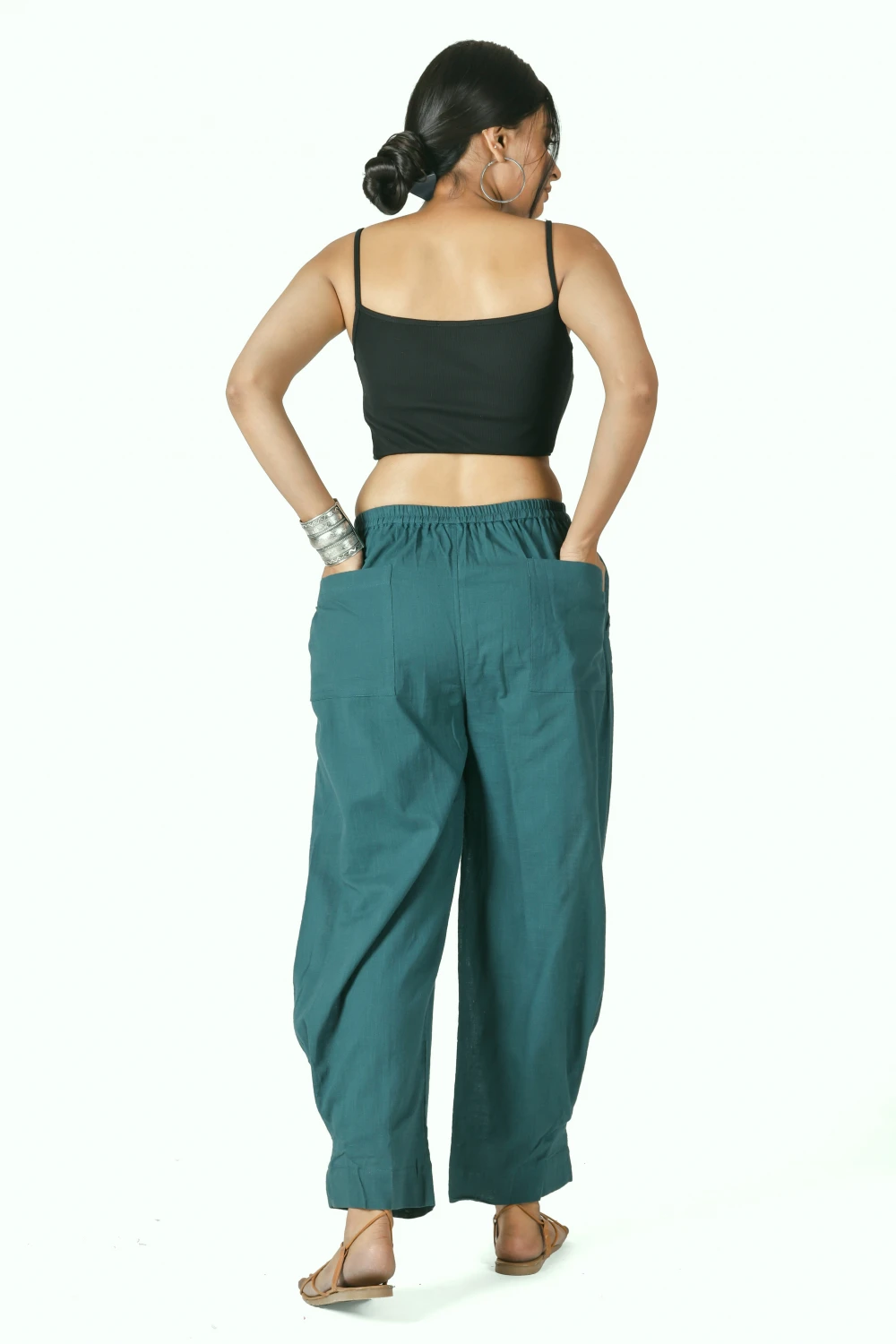 Bequeme Pluderhose aus luftiger Baumwolle in Leinenoptik. Die bequeme Hose hat einen elastischen Bund, zwei seitliche Taschen und zwei aufgesetzte Gesäßtaschen.