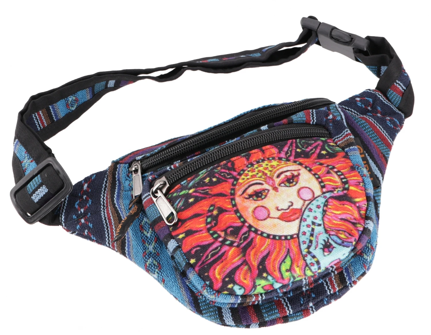 Praktische Gürteltasche aus traditionell nepalesischem Webstoff und farbenfrohem Sonne/Mond-Druck. Die Tasche hat drei geräumige Fächer mit Reißverschluss. Die farblich abgestimmten Stoffteile geben dieser Tasche ihren ganz individuellen Ethno-Touch. Jede Tasche ist ein Unikat. Das Muster des Webstoffes kann leicht von der Abbildung abweichen.