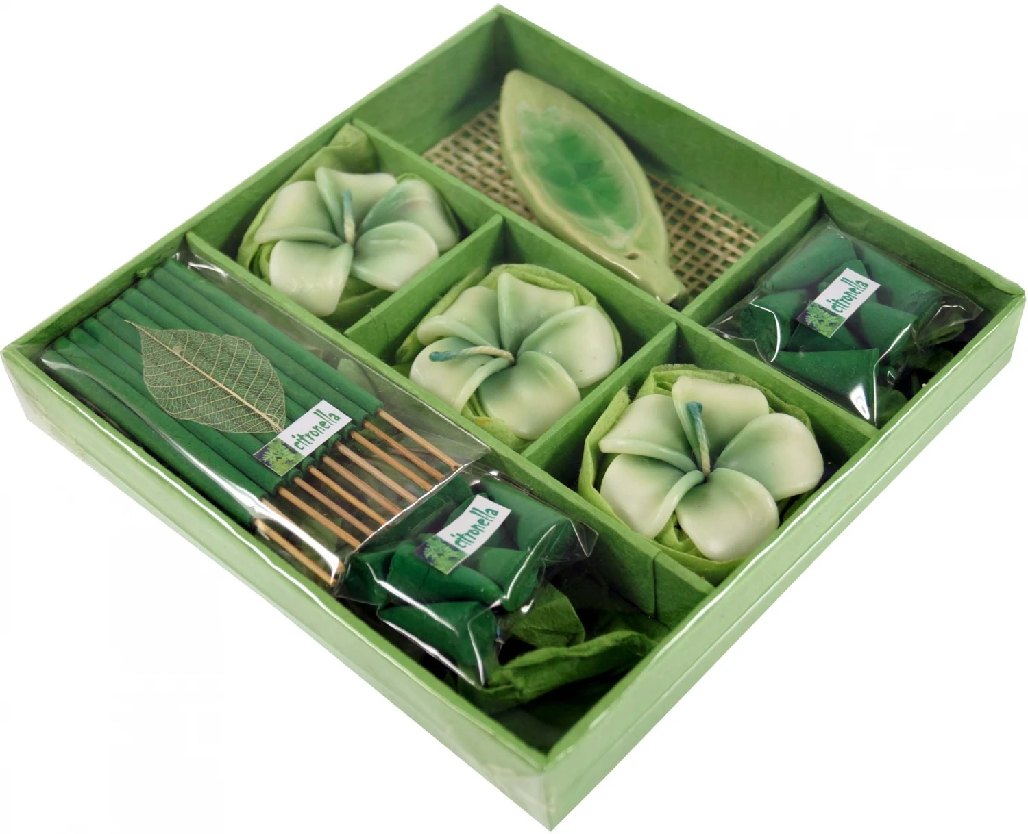 Liebevoll gestaltetes Geschenkset aus Thailand, bestehend aus einem Keramik Räucherstäbchenhalter in Form eines Blattes, drei Jasminblüten Schwimmkerzen, Räucherstäbchen und Räucherkegel. Im Handumdrehen zaubert man mit diesem schönen Set ein tropisches Ambiente mit zauberhaftem Duft.