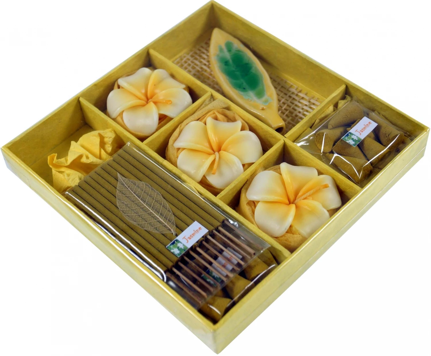 Liebevoll gestaltetes Geschenkset aus Thailand, bestehend aus einem Keramik Räucherstäbchenhalter in Form eines Blattes, drei Jasminblüten Schwimmkerzen, Räucherstäbchen und Räucherkegel. Im Handumdrehen zaubert man mit diesem schönen Set ein tropisches Ambiente mit zauberhaftem Duft.
