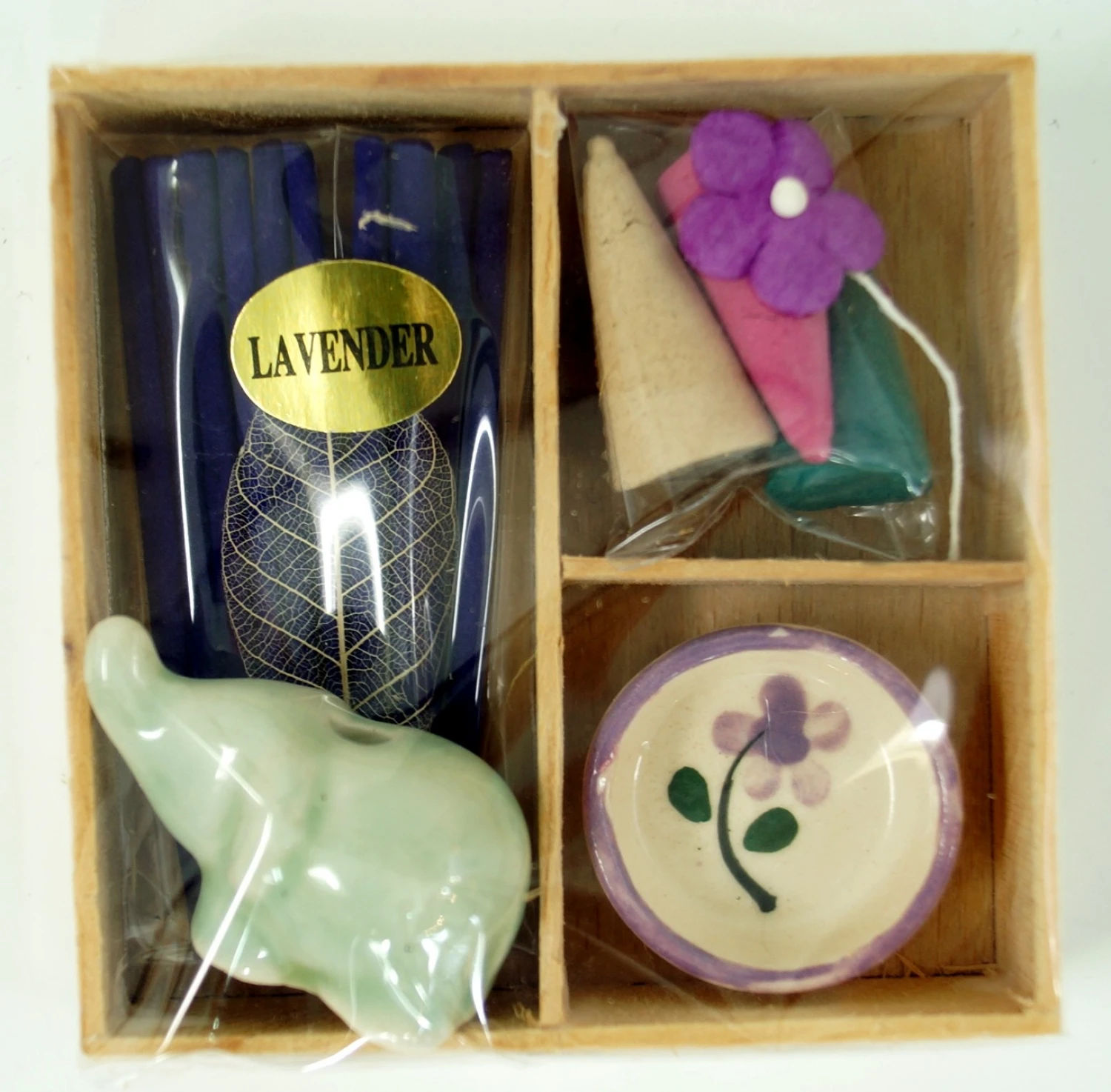 Das Räucherset besteht aus einer kleinen Holzbox, einem Räucherstäbchenhalter in Form eines kleinen Elefanten, einer Sorte Räucherstäbchen, drei verschiedenen Räucherkegeln und einem kleinen Keramikuntersetzer zum Abbrennen der Räucherkerzen. Dieses schöne Räucherwerk verzaubert jedes Ambiente mit seinen exotischen Düften.