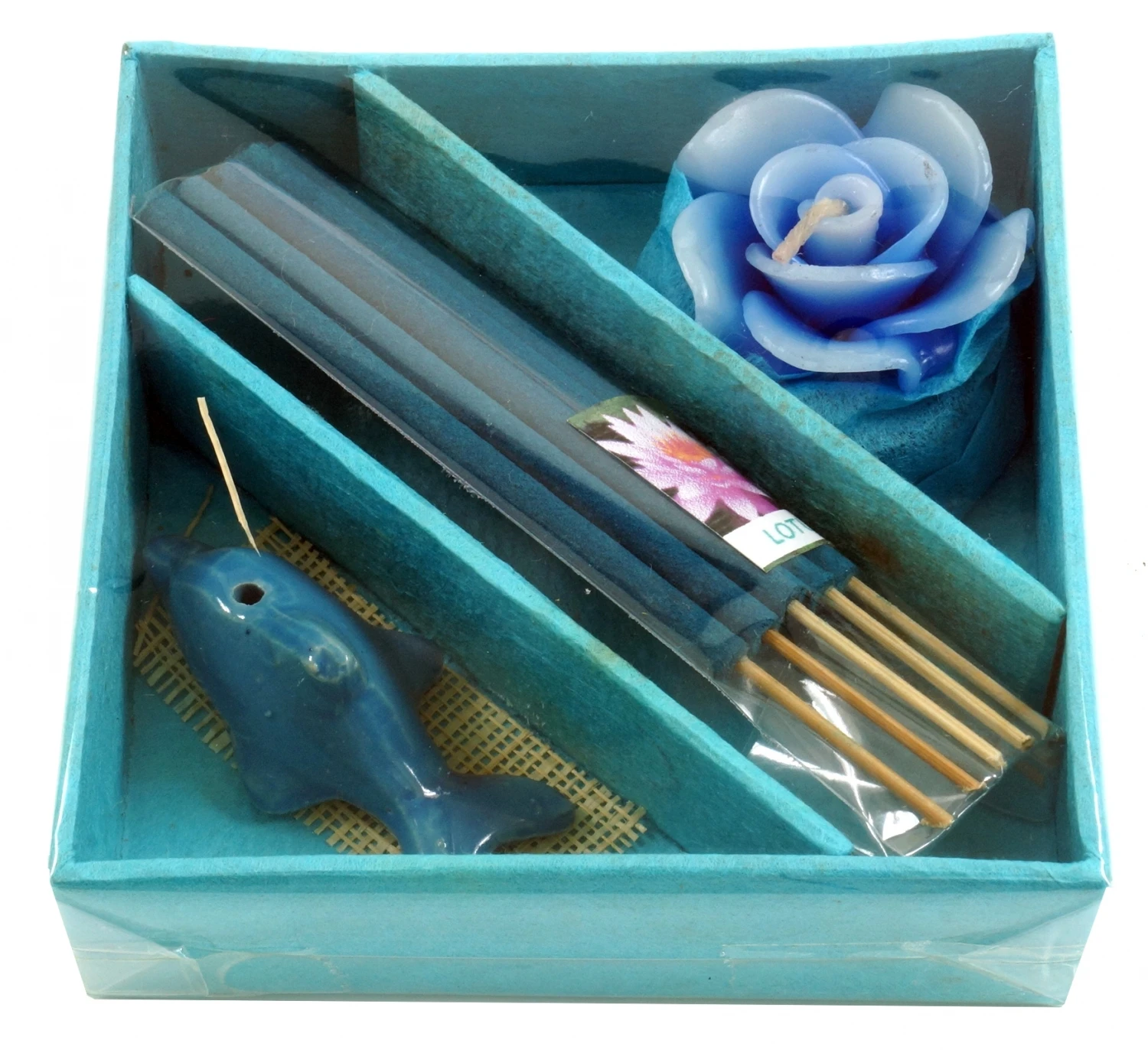 Buntes Geschenkset bestehend aus einem Keramik-Räucherstäbchenhalter Delphin, einer Rose und Räucherstäbchen.