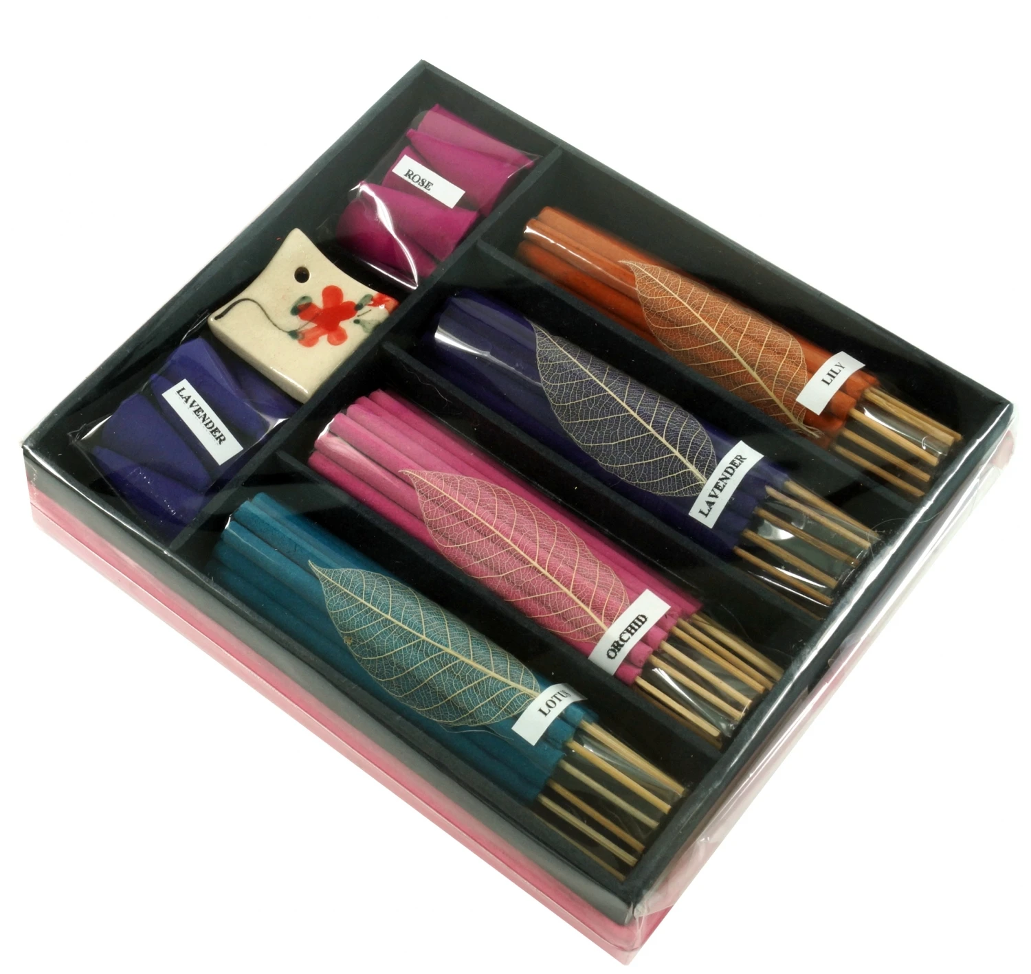 Buntes Geschenkset bestehend aus einem Keramik-Räucherstäbchenhalter und einer bunten Mischung wohlriechender Räucherstäbchen.